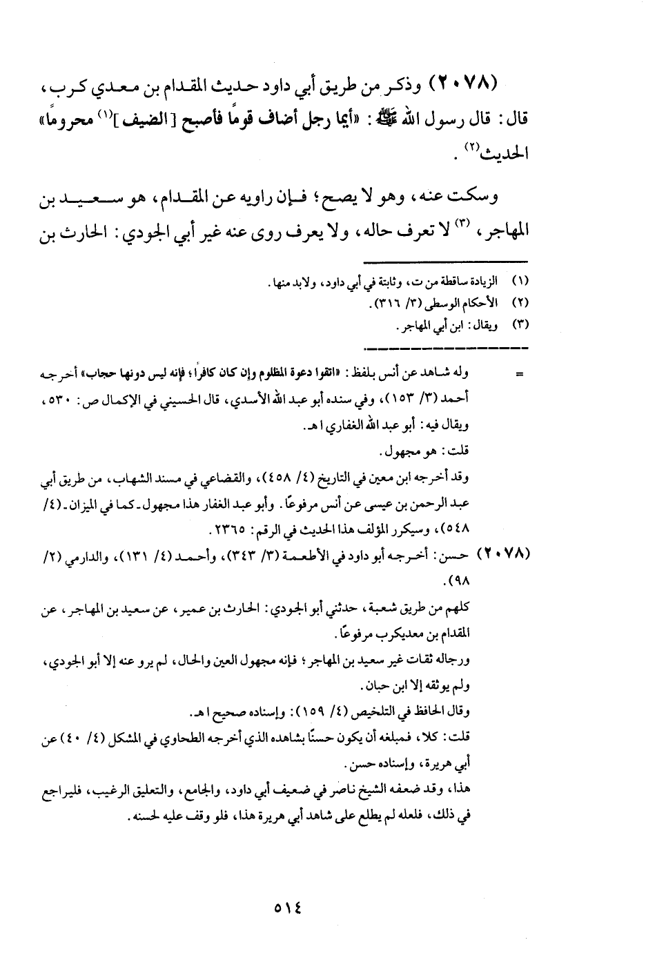 (2078) وَذكر من طَرِيق أبي دَاوُد حَدِيث الْمِقْدَام بن معدي كرب، قَالَ: قَالَ رَسُول الله - صَلَّى اللَّهُ عَلَيْهِ وَسَلَّم َ -: " أَيّمَا رجل أضَاف قوما فَأصْبح [الضَّيْف] محروما " الحَدِيث.