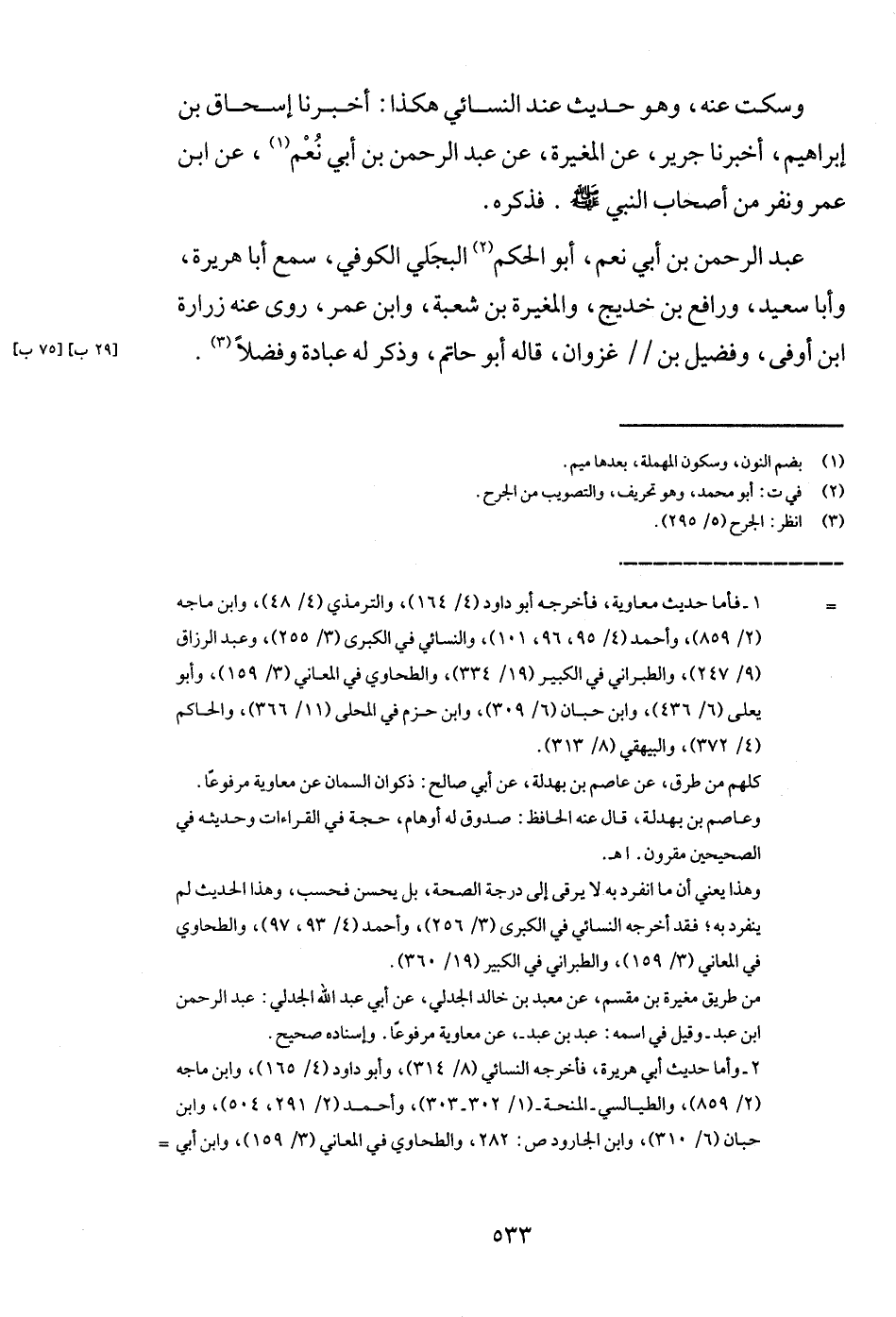 وَسكت عَنهُ، وَهُوَ حَدِيث عِنْد النَّسَائِيّ هَكَذَا: أخبرنَا إِسْحَاق بن إِبْرَاهِيم، أخبرنَا جرير، عَن الْمُغيرَة، عَن عبد الرَّحْمَن بن أبي نعم، عَن ابْن عمر وَنَفر من أَصْحَاب النَّبِي - صَلَّى اللَّهُ عَلَيْهِ وَسَلَّم َ -. فَذكره.