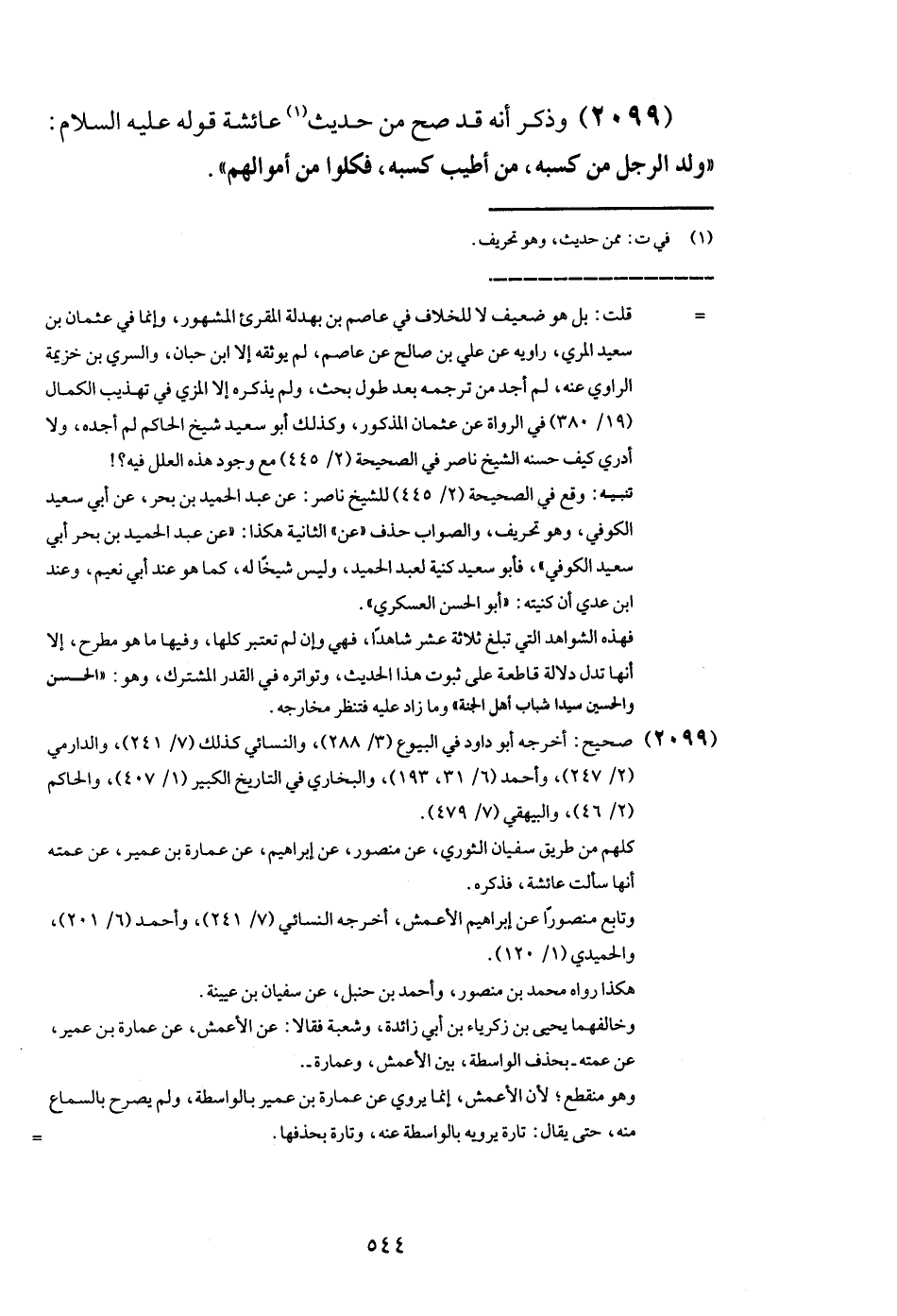 (2099) وَذكر أَنه قد صَحَّ من حَدِيث عَائِشَة قَوْله عَلَيْهِ السَّلَام: " ولد الرجل من كَسبه، من أطيب كَسبه، فَكُلُوا من أَمْوَالهم ".