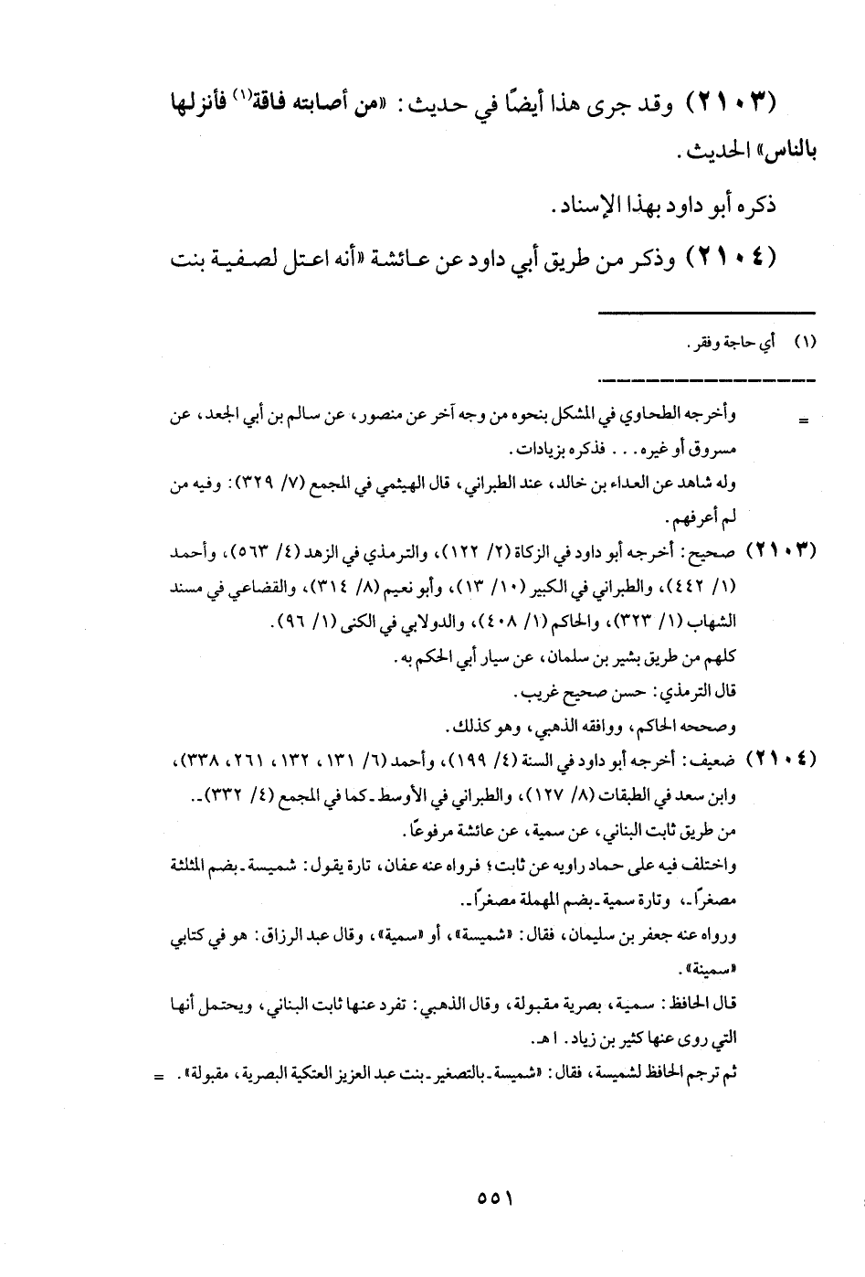 (2104) وَذكر من طَرِيق أبي دَاوُد عَن عَائِشَة " أَنه اعتل لصفية بنت