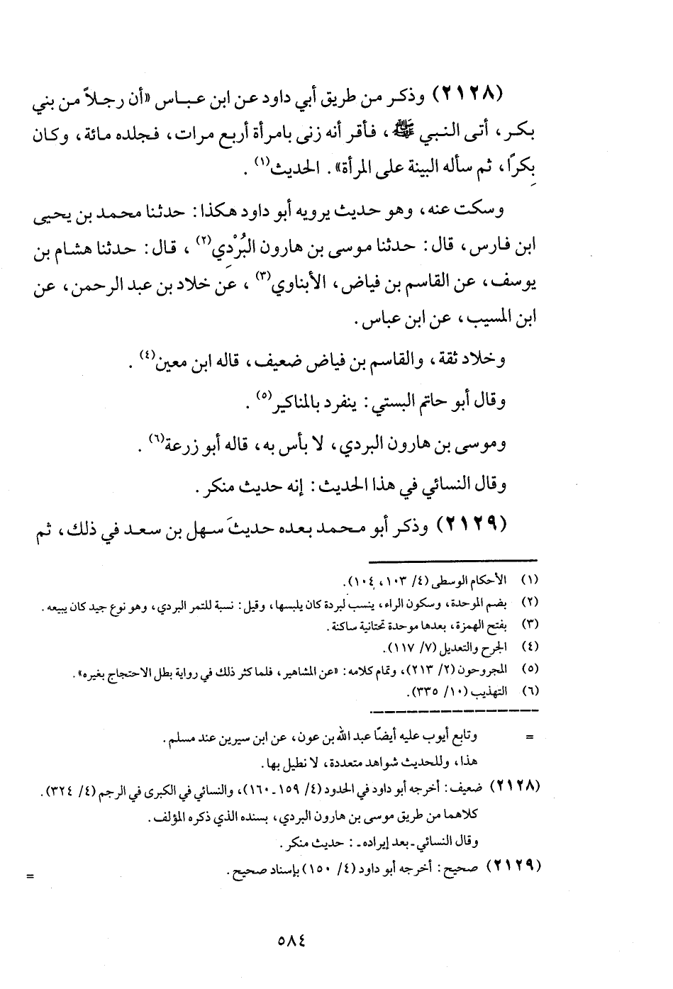 (2128) وَذكر من طَرِيق أبي دَاوُد عَن ابْن عَبَّاس " أَن رجلا من بني بكر، أَتَى النَّبِي - صَلَّى اللَّهُ عَلَيْهِ وَسَلَّم َ -، فَأقر أَنه زنى بِامْرَأَة أَربع مَرَّات، فجلده مائَة، وَكَانَ بكرا، ثمَّ سَأَلَهُ الْبَيِّنَة على الْمَرْأَة ". الحَدِيث.