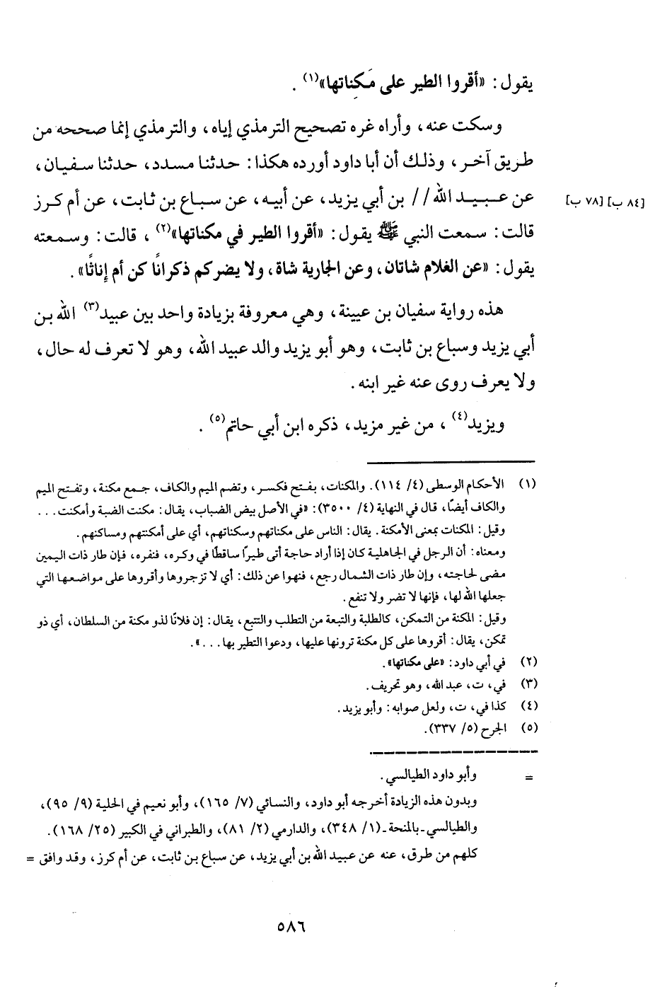 وَسكت عَنهُ، وَأرَاهُ غره تَصْحِيح التِّرْمِذِيّ إِيَّاه، وَالتِّرْمِذِيّ إِنَّمَا صَححهُ من طَرِيق آخر، وَذَلِكَ أَن أَبَا دَاوُد أوردهُ هَكَذَا: حَدثنَا مُسَدّد، حَدثنَا سُفْيَان، عَن عبيد الله بن أبي يزِيد، عَن أَبِيه، عَن سِبَاع بن ثَابت، عَن أم كرز قَالَت: سَمِعت النَّبِي - صَلَّى اللَّهُ عَلَيْهِ وَسَلَّم َ - يَقُول: " أقرُّوا الطير فِي مكناتها "، قَالَت: وسمعته يَقُول: " عَن الْغُلَام شَاتَان، وَعَن الْجَارِيَة شَاة، وَلَا يضركم ذكرانا كن أم إِنَاثًا ".