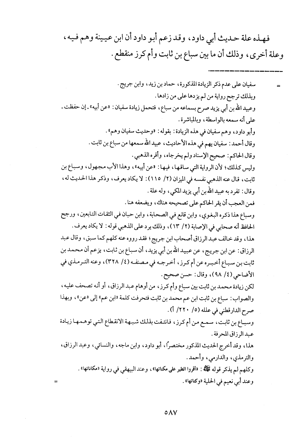 فَهَذِهِ عِلّة حَدِيث أبي دَاوُد، وَقد زعم أَبُو دَاوُد أَن ابْن عُيَيْنَة وهم فِيهِ، وَعلة أُخْرَى، وَذَلِكَ أَن مَا بَين سِبَاع بن ثَابت وَأم كرز مُنْقَطع.