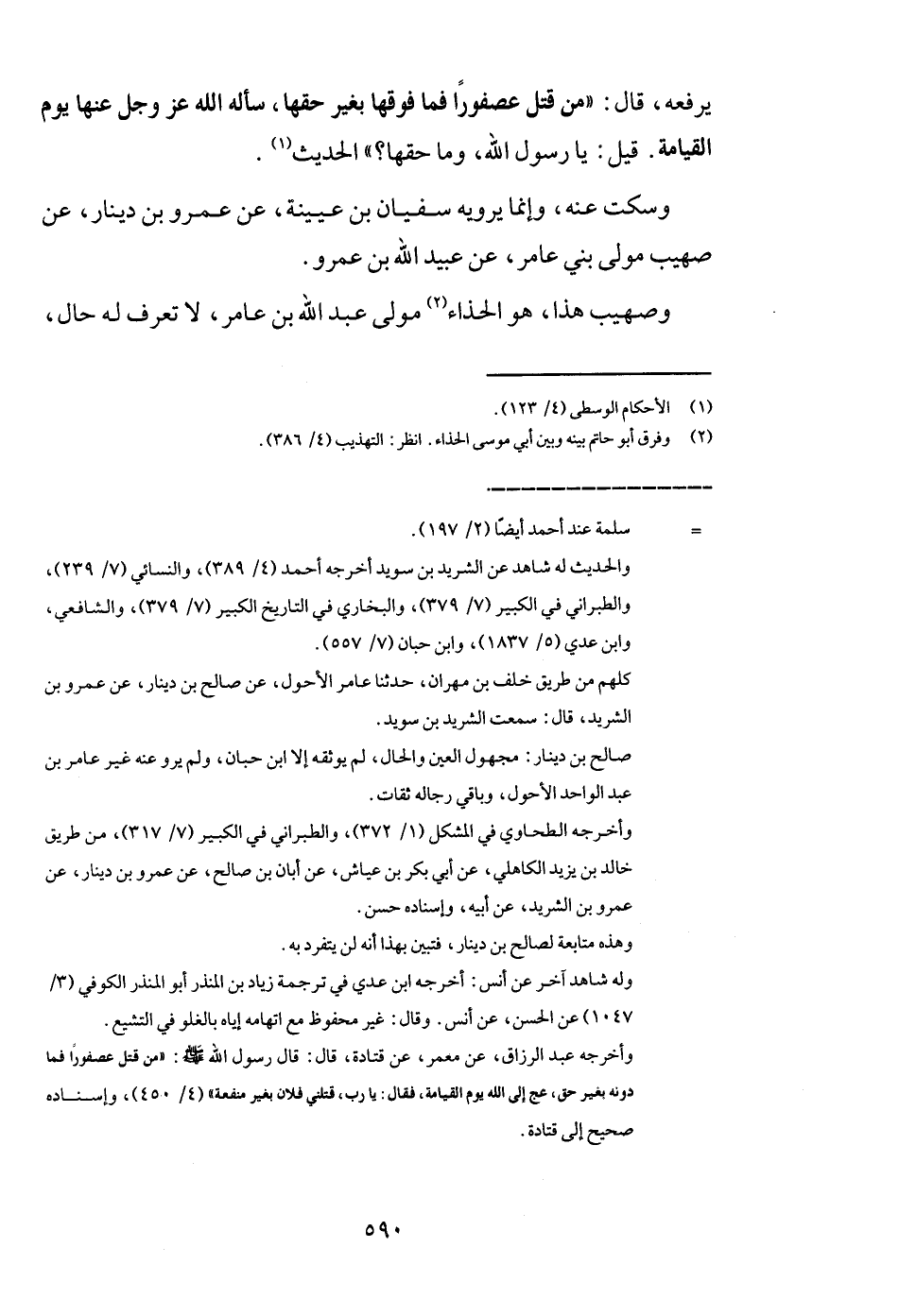 يرفعهُ، قَالَ: " من قتل عصفورا فَمَا فَوْقهَا بِغَيْر حَقّهَا، سَأَلَهُ الله عز وَجل عَنْهَا يَوْم الْقِيَامَة. قيل: يَا رَسُول الله، وَمَا حَقّهَا؟ " الحَدِيث.