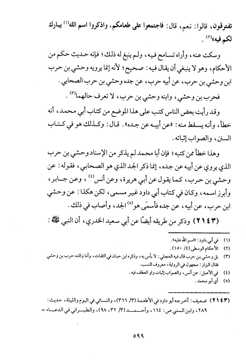 وَهَذَا خطأ مِمَّن كتبه؛ فَإِن أَبَا مُحَمَّد لم يذكر من الْإِسْنَاد وَحشِي بن حَرْب الَّذِي يروي عَن أَبِيه عَن جده، إِنَّمَا ذكر الْجد الَّذِي هُوَ الصَّحَابِيّ، فَقَوله: عَن وَحشِي بن حَرْب، كَمَا يَقُول عَن أبي هُرَيْرَة، وَعَن أنس، وَعَن جَابر، وأبرز اسْمه، وَكَانَ فِي كتاب أبي دَاوُد غير مُسَمّى، لَكِن هَكَذَا: عَن وَحشِي ابْن حَرْب، عَن أَبِيه، عَن جده فأسمى هُوَ الْجد، وَأصَاب فِي ذَلِك.