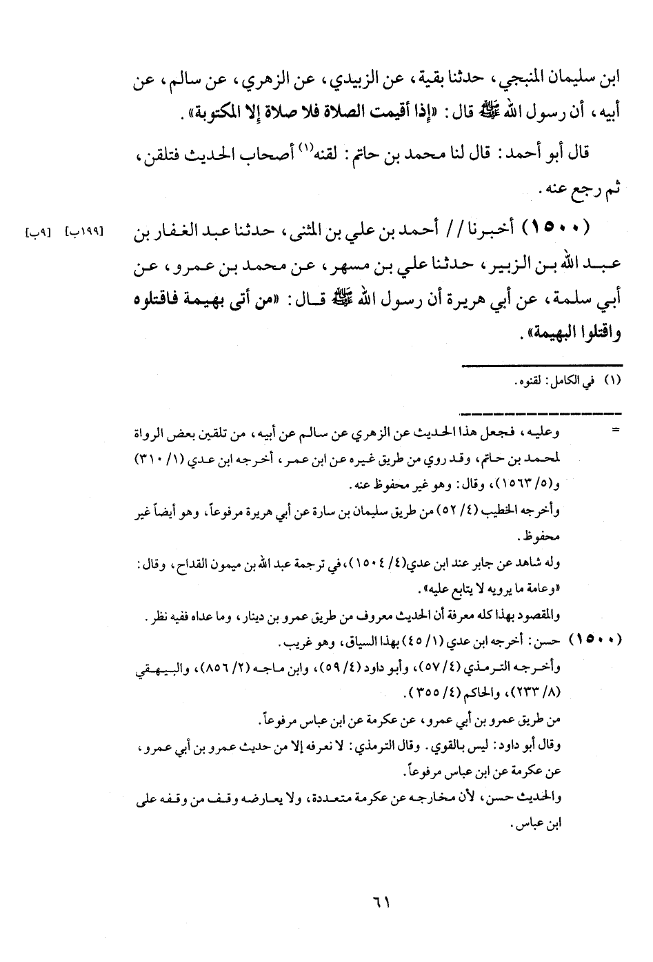 (1500) أخبرنَا أَحْمد بن عَليّ بن الْمثنى، حَدثنَا عبد الْغفار بن عبد الله بن الزبير، حَدثنَا عَليّ بن مسْهر، عَن مُحَمَّد بن عَمْرو، عَن أبي سَلمَة، عَن أبي هُرَيْرَة أَن رَسُول الله - صَلَّى اللَّهُ عَلَيْهِ وَسَلَّم َ - قَالَ: " من أَتَى بَهِيمَة فَاقْتُلُوهُ واقتلوا الْبَهِيمَة ".