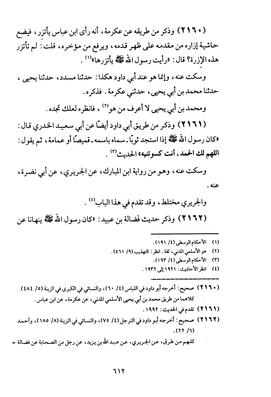 (2160) وَذكر من طَرِيقه عَن عِكْرِمَة، أَنه رأى ابْن عَبَّاس يأتزر، فَيَضَع حَاشِيَة إزَاره من مقدمه على ظهر قدمه، وَيرْفَع من مؤخره، قلت: لم تأتزر هَذِه الإزرة؟ قَالَ: " رَأَيْت رَسُول الله - صَلَّى اللَّهُ عَلَيْهِ وَسَلَّم َ - يأتزرها ".
