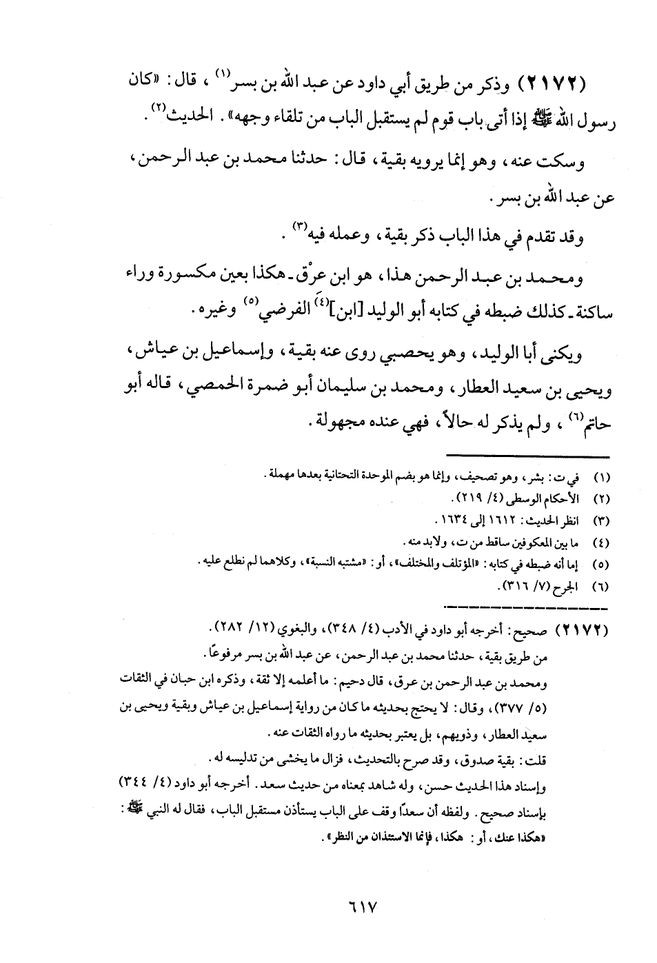 (2172) وَذكر من طَرِيق أبي دَاوُد عَن عبد الله بن بسر، قَالَ: " كَانَ رَسُول الله - صَلَّى اللَّهُ عَلَيْهِ وَسَلَّم َ - إِذا أَتَى بَاب قوم لم يسْتَقْبل الْبَاب من تِلْقَاء وَجهه ". الحَدِيث.
