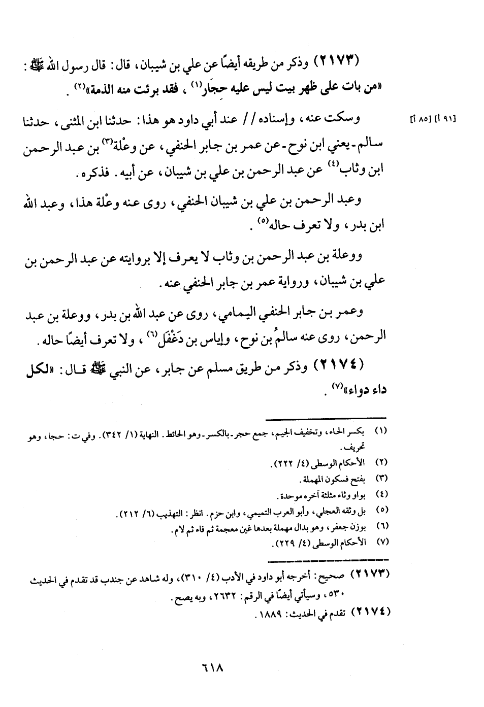 (2173) وَذكر من طَرِيقه أَيْضا عَن عَليّ بن شَيبَان، قَالَ: قَالَ رَسُول الله - صَلَّى اللَّهُ عَلَيْهِ وَسَلَّم َ -: " من بَات على ظهر بَيت لَيْسَ عَلَيْهِ حجار، فقد بَرِئت مِنْهُ الذِّمَّة ".