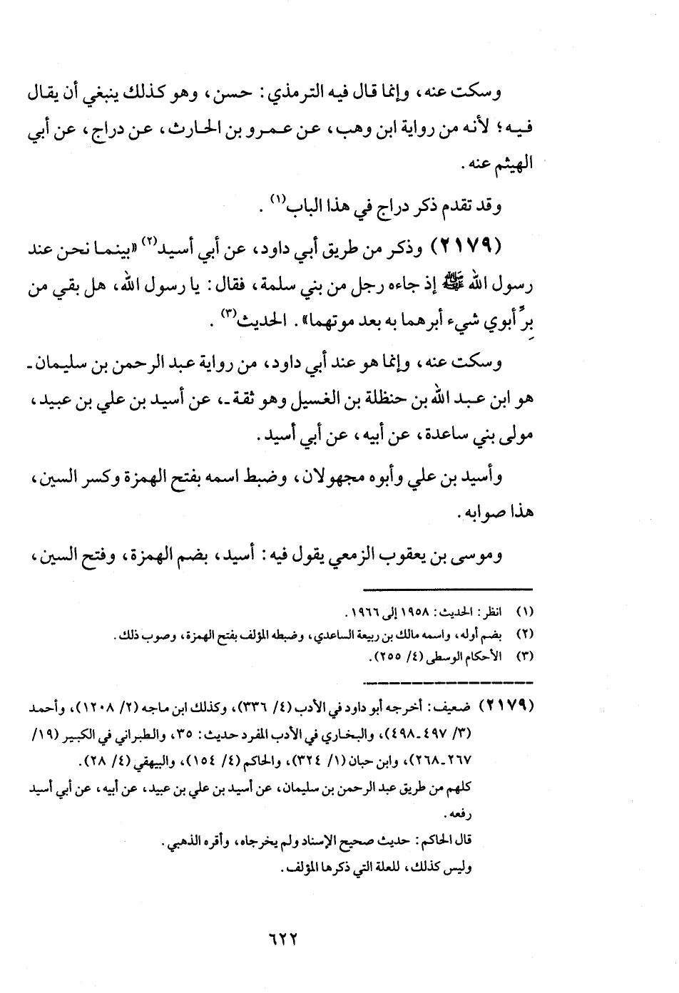 (2179) وَذكر من طَرِيق أبي دَاوُد، عَن أبي أسيد " بَيْنَمَا نَحن عِنْد رَسُول الله - صَلَّى اللَّهُ عَلَيْهِ وَسَلَّم َ - إِذْ جَاءَهُ رجل من بني سَلمَة، فَقَالَ: يَا رَسُول الله، هَل بَقِي من بر أَبَوي شَيْء أبرهما بِهِ بعد مَوْتهمَا " الحَدِيث.