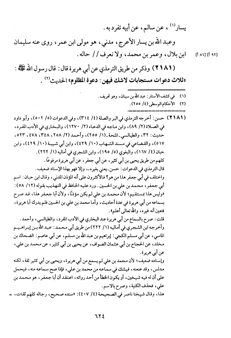 (2181) وَذكر من طَرِيق التِّرْمِذِيّ عَن أبي هُرَيْرَة قَالَ: قَالَ رَسُول الله - صَلَّى اللَّهُ عَلَيْهِ وَسَلَّم َ -: " ثَلَاث دعوات مستجابات لَا شكّ فِيهِنَّ: دَعْوَة الْمَظْلُوم " الحَدِيث.