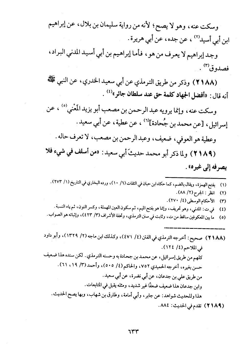 (2188) وَذكر من طَرِيق التِّرْمِذِيّ عَن أبي سعيد الْخُدْرِيّ، عَن النَّبِي - صَلَّى اللَّهُ عَلَيْهِ وَسَلَّم َ - أَنه قَالَ: " أفضل الْجِهَاد كلمة حق عِنْد سُلْطَان جَائِر ".