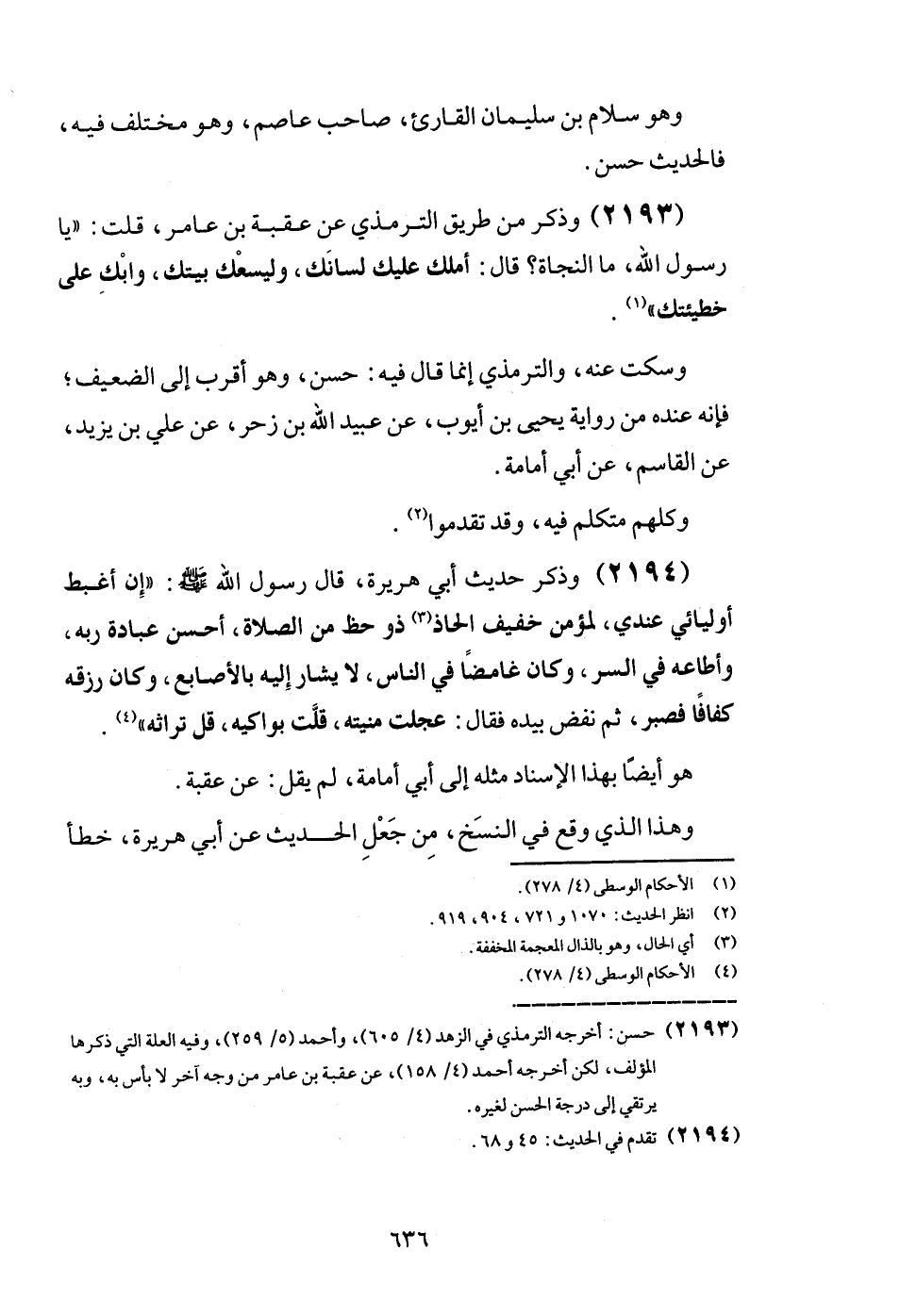 (2193) وَذكر من طَرِيق التِّرْمِذِيّ عَن عقبَة بن عَامر، قلت: " يَا رَسُول الله، مَا النجَاة؟ قَالَ: أملك عَلَيْك لسَانك، وليسعك بَيْتك، وابك على خطيئتك ".
