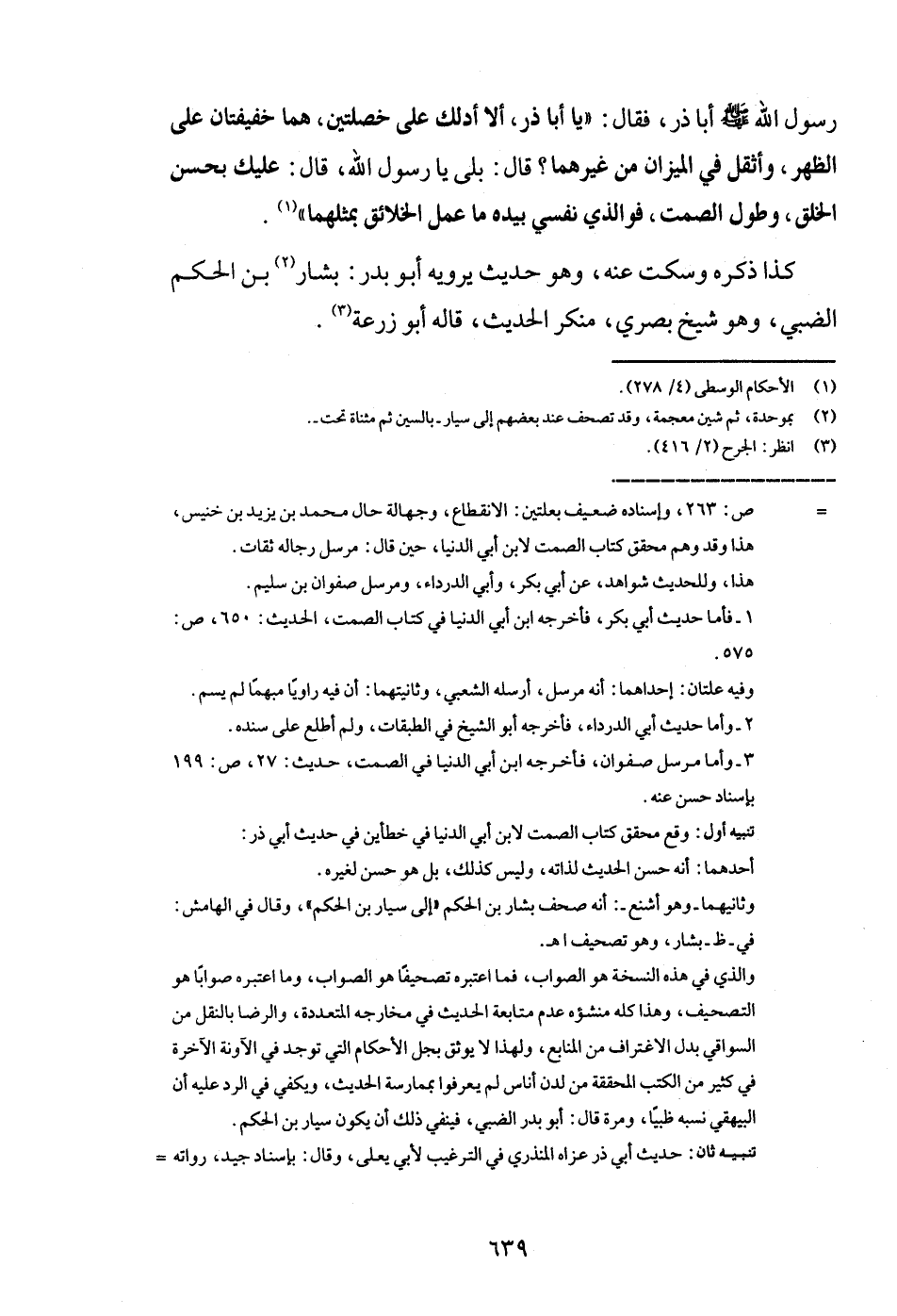رَسُول الله - صَلَّى اللَّهُ عَلَيْهِ وَسَلَّم َ - أَبَا ذَر، فَقَالَ: " يَا أَبَا ذَر، أَلا أدلك على خَصْلَتَيْنِ، هما خفيفتان على الظّهْر، وأثقل فِي الْمِيزَان من غَيرهمَا؟ قَالَ: بلَى يَا رَسُول الله، قَالَ: عَلَيْك بِحسن الْخلق، وَطول الصمت، فوالذي نَفسِي بِيَدِهِ مَا عمل الْخَلَائق بمثلهما ".