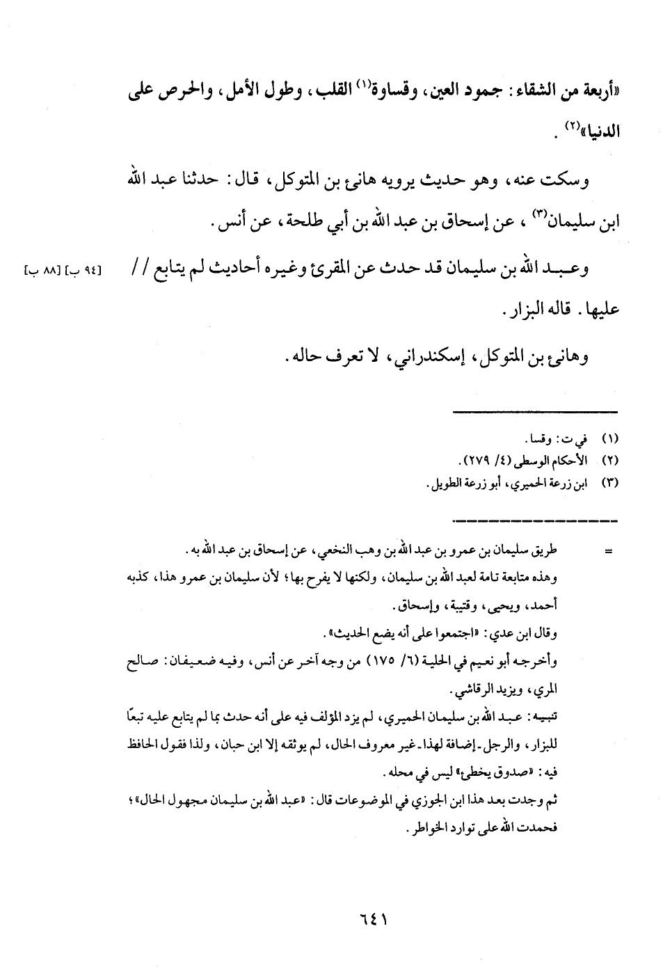 وَسكت عَنهُ، وَهُوَ حَدِيث يرويهِ هَانِئ بن المتَوَكل، قَالَ: حَدثنَا عبد الله ابْن سُلَيْمَان، عَن إِسْحَاق بن عبد الله بن أبي طَلْحَة، عَن أنس.