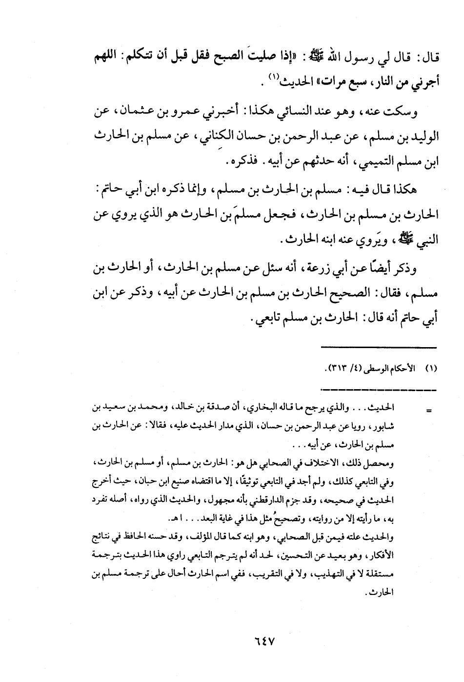 هَكَذَا قَالَ فِيهِ: مُسلم بن الْحَارِث بن مُسلم، وَإِنَّمَا ذكره ابْن أبي حَاتِم: الْحَارِث بن مُسلم بن الْحَارِث، فَجعل مُسلم بن الْحَارِث هُوَ الَّذِي يروي عَن النَّبِي - صَلَّى اللَّهُ عَلَيْهِ وَسَلَّم َ -، ويروي عَنهُ ابْنه الْحَارِث.