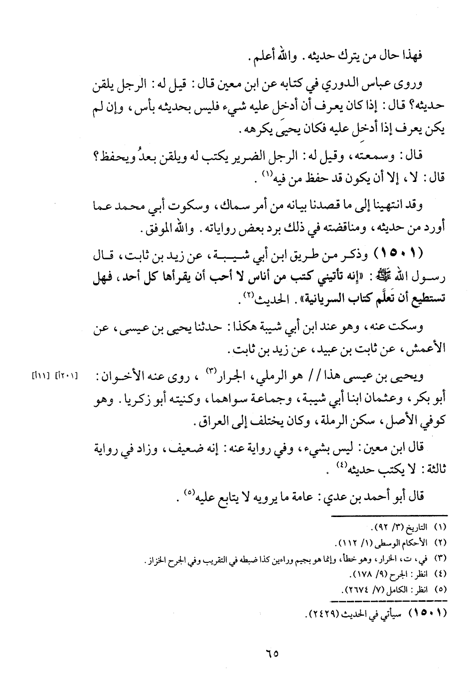 (1501) وَذكر من طَرِيق ابْن أبي شيبَة، عَن زيد بن ثَابت، قَالَ رَسُول الله - صَلَّى اللَّهُ عَلَيْهِ وَسَلَّم َ -: " إِنَّه تَأتِينِي كتب من أنَاس لَا أحب أَن يَقْرَأها كل أحد، فَهَل تَسْتَطِيع أَن تعلم كتاب السريانية ". الحَدِيث.