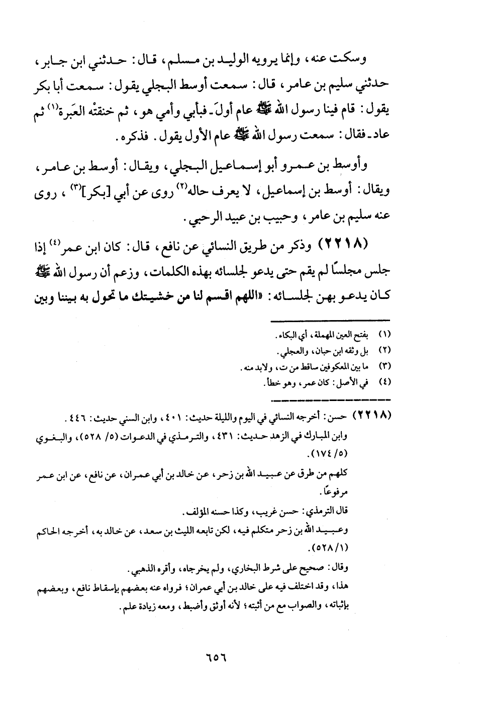 (2218) وَذكر من طَرِيق النَّسَائِيّ عَن نَافِع، قَالَ: كَانَ ابْن عمر إِذا جلس مَجْلِسا لم يقم حَتَّى يَدْعُو لجلسائه بِهَذِهِ الْكَلِمَات، وَزعم أَن رَسُول الله - صَلَّى اللَّهُ عَلَيْهِ وَسَلَّم َ - كَانَ يَدْعُو بِهن لجلسائه: " اللَّهُمَّ اقْسمْ لنا من خشيتك مَا تحول بِهِ بَيْننَا وَبَين