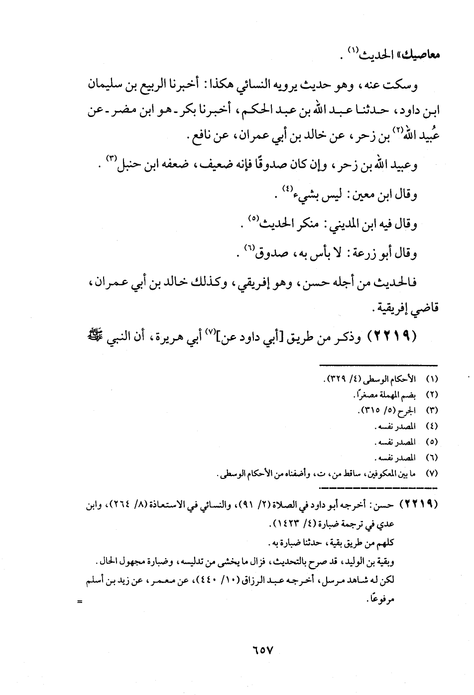 وَسكت عَنهُ، وَهُوَ حَدِيث يرويهِ النَّسَائِيّ هَكَذَا: أخبرنَا الرّبيع بن سُلَيْمَان ابْن دَاوُد، حَدثنَا عبد الله بن عبد الحكم، أخبرنَا بكر - هُوَ ابْن مُضر - عَن عبيد الله بن زحر، عَن خَالِد بن أبي عمرَان، عَن نَافِع.