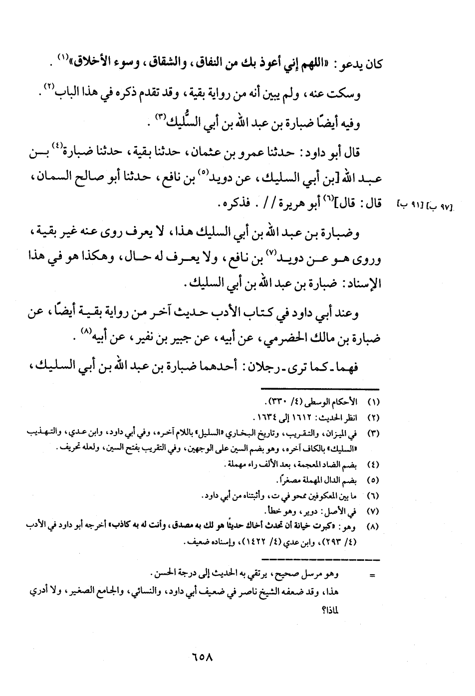 وضبارة بن عبد الله بن أبي السليك هَذَا، لَا يعرف روى عَنهُ غير بَقِيَّة، وروى هُوَ عَن دويد بن نَافِع، وَلَا يعرف لَهُ حَال، وَهَكَذَا هُوَ فِي هَذَا الْإِسْنَاد: ضبارة بن عبد الله بن أبي السليك.