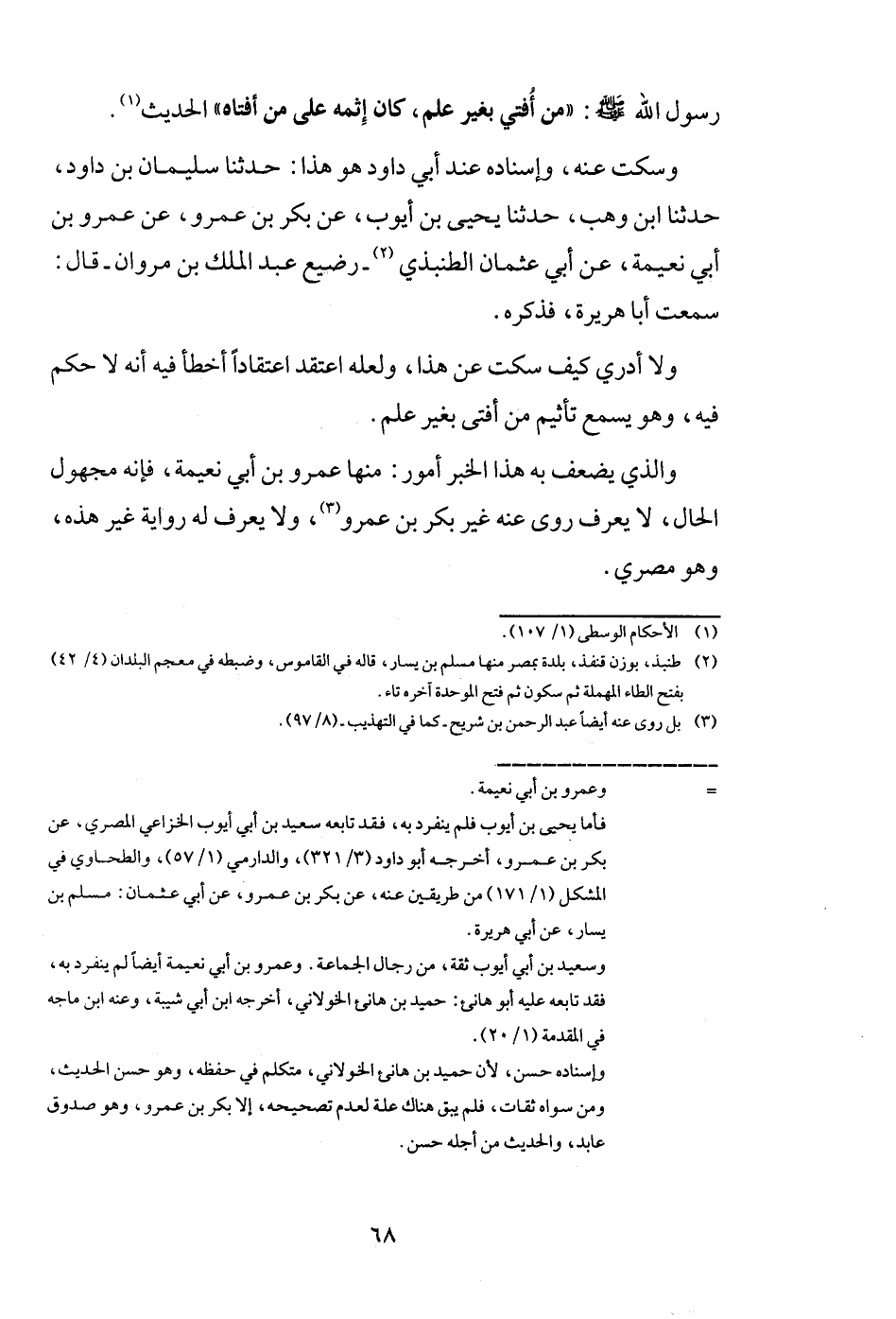 وَسكت عَنهُ، وَإِسْنَاده عِنْد أبي دَاوُد هُوَ هَذَا: حَدثنَا سُلَيْمَان بن دَاوُد، حَدثنَا ابْن وهب، حَدثنَا يحيى بن أَيُّوب، عَن بكر بن عَمْرو، عَن عُمَيْر بن أبي نعيمة، عَن أبي عُثْمَان الطنبذي - رَضِيع عبد الْملك بن مَرْوَان - قَالَ: سَمِعت أَبَا هُرَيْرَة، فَذكره.