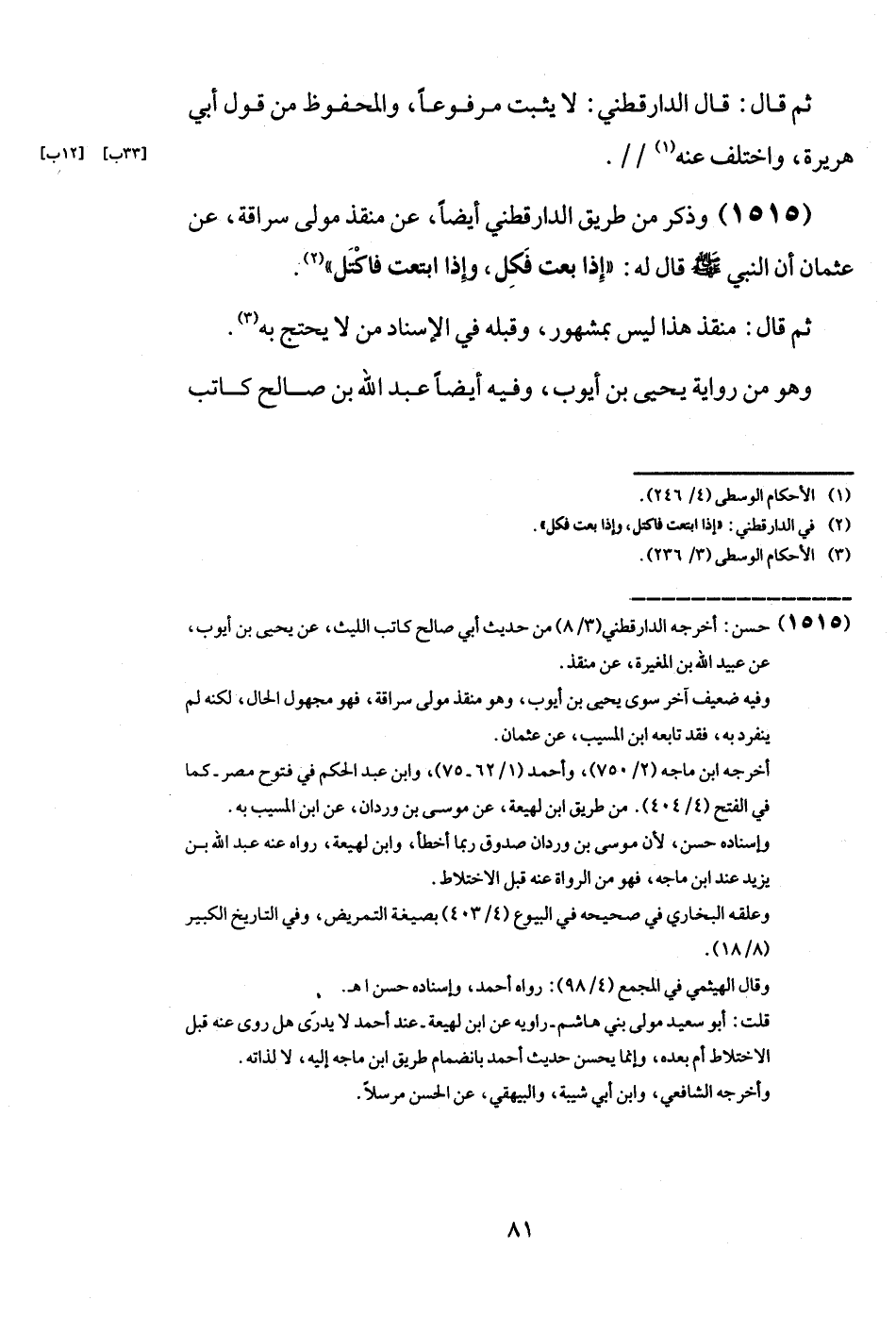 (1515) وَذكر من طَرِيق الدَّارَقُطْنِيّ أَيْضا، عَن منقذ مولى سراقَة، عَن عُثْمَان أَن النَّبِي - صَلَّى اللَّهُ عَلَيْهِ وَسَلَّم َ - قَالَ لَهُ:: إِذا بِعْت فَكل، وَإِذا ابتعت فاكتل ".