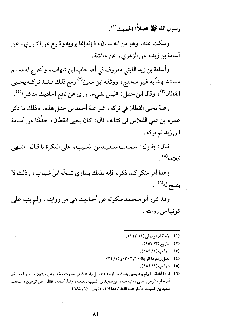 وَعلة يحيى الْقطَّان فِي تَركه، غير عِلّة أَحْمد بن حَنْبَل هَذِه، وَذَلِكَ مَا ذكر عَمْرو بن عَليّ الفلاس فِي كِتَابه، قَالَ: كَانَ يحيى الْقطَّان، حَدثنَا عَن أُسَامَة ابْن زيد ثمَّ تَركه.