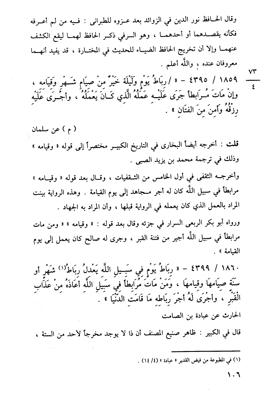1860/ 4399 - "رِبَاطُ يَوْمٍ فِي سَبيلِ اللَّهِ يَعْدلُ رِبَاطُ (¬1) شَهْرٍ أو سَنَة صيَامهَا وقِيامهَا، وَمَنْ مَاتَ مُرَابِطًا فِي سَبيَلِ اللَّه أعَاذَهُ مِنْ عَذَابِ الْقَبْر، وأجْرَى لَهُ أجْرَ رِبَاطِهِ مَا قَامَتِ الدّنْيَا".