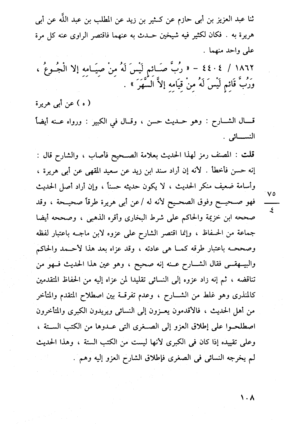قلت: المصنف رمز لهذا الحديث بعلامة الصحيح فأصاب، والشارح قال: إنه حسن فأخطأ. لأنه إن أراد سند ابن زيد عن سعيد المقهى عن أبي هريرة، وأسامة ضعيف منكر الحديث، لا يكون حديثه حسنًا، وإن أراد أصل الحديث فهو صحيح وفوق الصحيح لأنه له عن أبي هريرة طرقًا صحيحة، وقد صححه ابن خزيمة والحاكم على شرط البخارى وأقره الذهبى، وصححه أيضًا جماعة من الحفاظ، وإنما اقتصر الشارح على عزوه لابن ماجه باعتبار لفظه وصححه باعتبار طرقه كما هي عادته، وقد عزاه بعد هذا لأحمد والحاكم والبيهقى فقال الشارح عنه إنه صحيح، وهو عين هذا الحديث فهو من تناقضه، ثم إنه زاد عزوه إلى النسائى تقليدا لمن عزاه إليه من الحفاظ المتقدمين كالمنذرى وهو غلط من الشارح، وعدم تفرقة بين اصطلاح المتقدم والمتأخر من أهل الحديث، فالأقدمون يعزون إلى النسائى ويريدون الكبرى والمتأخرون اصطلحوا على إطلاق العزو إلى الصغرى التي عدوها من الكتب الستة، وعلى تقييده إذا كان في الكبرى لأنها ليست من الكتب الستة، وهذا الحديث لم يخرجه النسائى في الصغرى فإطلاق الشارح العزو إليه وهم.