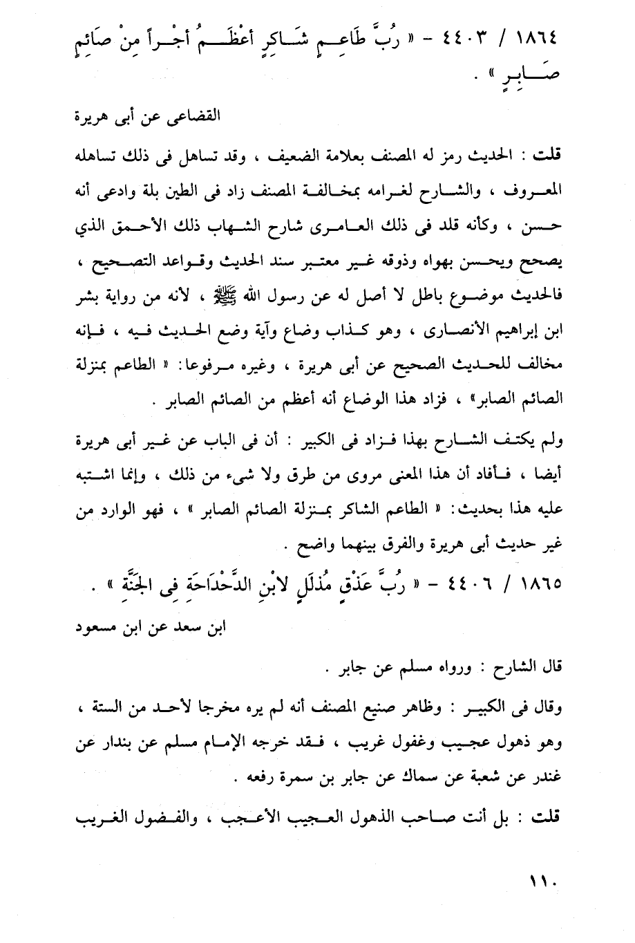 1864/ 4403 - "رُبَّ طَاعِمٍ شَاكِرٍ أعْظَمُ أجْرًا مِنْ صَائِمٍ صَابِرٍ".