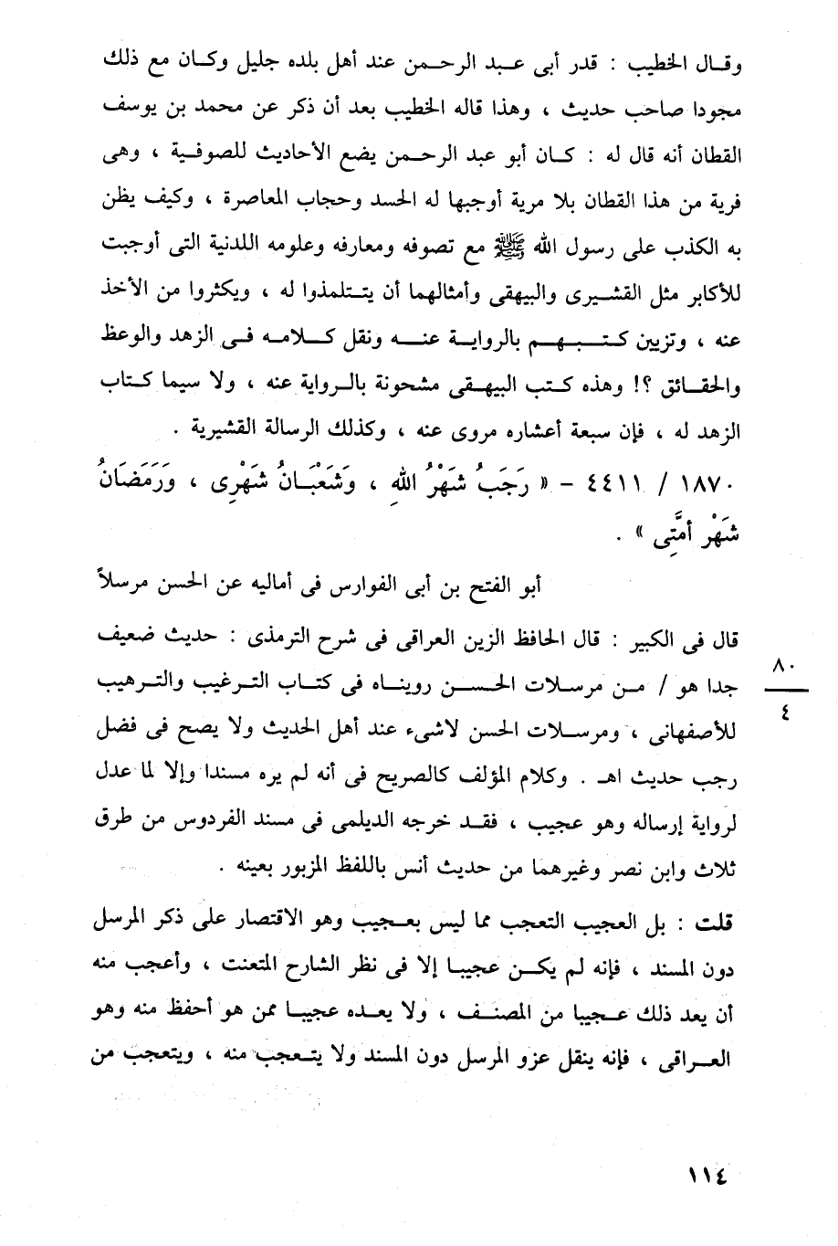 قال في الكبير: قال الحافظ الزين العراقى في شرح الترمذى: حديث ضعيف جدا هو من مرسلات الحسن رويناه في كتاب الترغيب والترهيب للأصفهانى، ومرسلات الحسن لا شيء عند أهل الحديث ولا يصح في فضل رجب حديث اهـ. وكلام المؤلف كالصريح في أنه لم يره مسندا وإلا لما عدل لرواية إرساله وهو عجيب، فقد خرجه الديلمى في مسند الفردوس من طرق ثلاث وابن نصر وغيرهما من حديث أنس باللفظ المزبور بعينه.