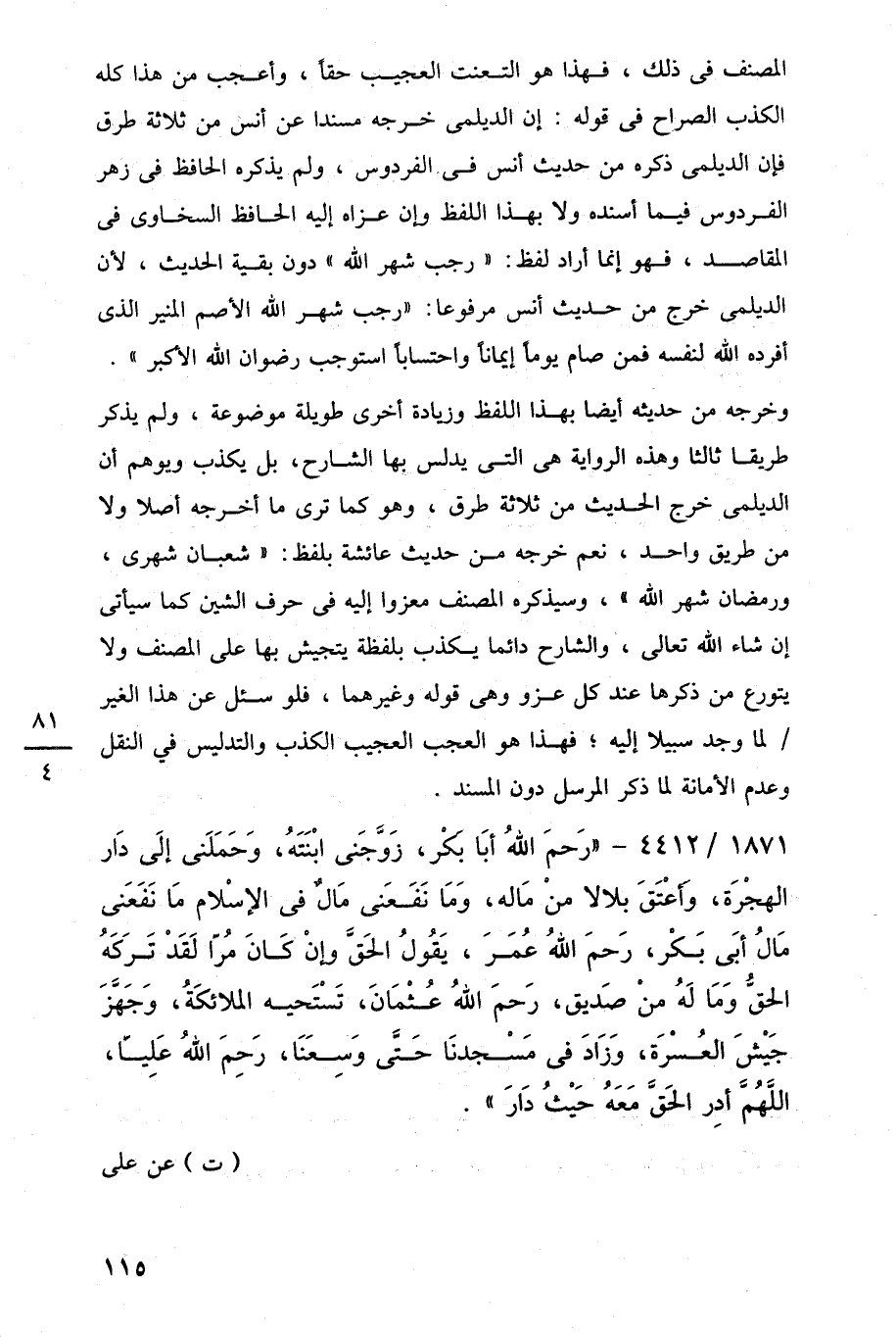 المصنف في ذلك، فهذا هو التعنت العجيب حقًا، وأعجب من هذا كله الكذب الصراح في قوله: إن الديلمى خرجه مسندا عن أنس من ثلاثة طرق فإن الديلمى ذكره من حديث أنس في الفردوس، ولم يذكره الحافظ في زهر الفردوس فيما أسنده ولا بهذا اللفظ وإن عزاه إليه الحافظ السخاوى في المقاصد، فهو إنما أراد لفظ: "رجب شهر اللَّه" دون بقية الحديث، لأن الديلمى خرج من حديث أنس مرفوعًا: "رجب شهر اللَّه الأصم المنير الذي أفرده اللَّه لنفسه فمن صام يومًا إيمانًا واحتسابًا استوجب رضوان اللَّه الأكبر".
