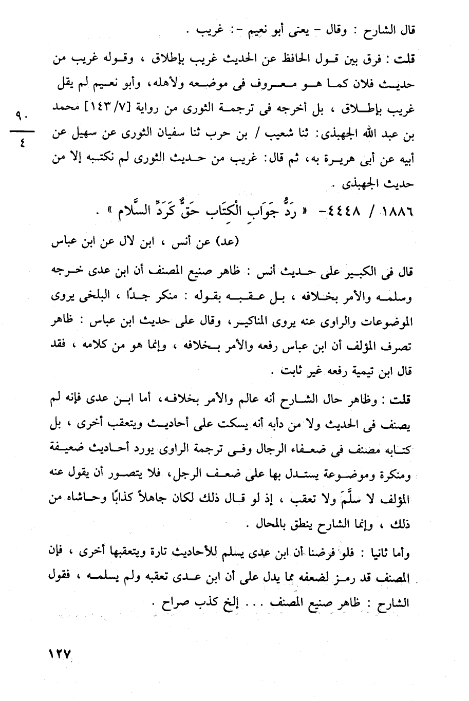 قلت: وظاهر حال الشارح أنه عالم والأمر بخلافه، أما ابن عدى فإنه لم يصنف في الحديث ولا من دأبه أنه يسكت على أحاديث ويتعقب أخرى، بل كتابه مصنف في ضعفاء الرجال وفي ترجمة الراوى يورد أحاديث ضعيفة ومنكرة وموضوعة يستدل بها على ضعف الرجل، فلا يتصور أن يقول عنه المؤلف لا سلَّمَ ولا تعقب، إذ لو قال ذلك لكان جاهلًا كذابًا وحاشاه من ذلك، وإنما الشارح ينطق بالمحال.