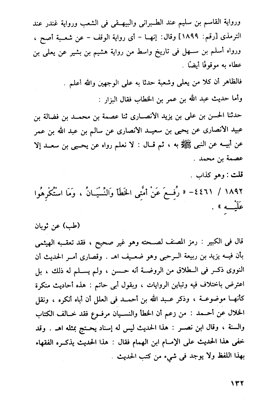 1892/ 4461 - "رُفِعَ عَنْ أُمَّتِى الخَطَأ وَالنِّسْيَانُ، وَمَا اسْتكْرِهُوا عَلَيْهِ".
