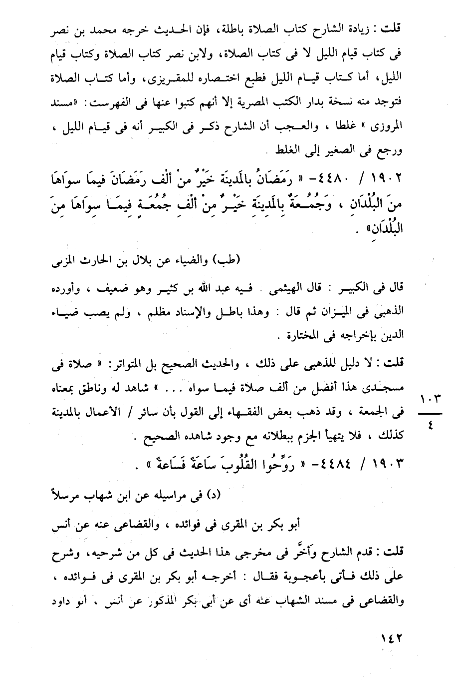 قلت: زيادة الشارح كتاب الصلاة باطلة، فإن الحديث خرجه محمد بن نصر في كتاب قيام الليل لا في كتاب الصلاة، ولابن نصر كتاب الصلاة وكتاب قيام الليل، أما كتاب قيام الليل فطبع اختصاره للمقريزى، وأما كتاب الصلاة فتوجد منه نسخة بدار الكتب المصرية إلا أنهم كتبوا عنها في الفهرست: "مسند المروزى" غلطا، والعجب أن الشارح ذكر في الكبير أنه في قيام الليل، ورجع في الصغير إلى الغلط.