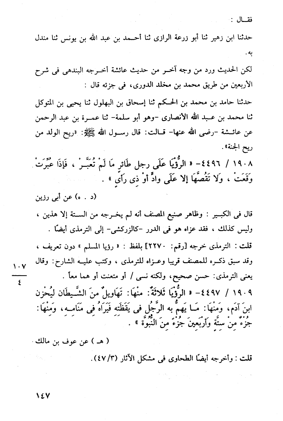 1908/ 4496 - "الرُّؤْيَا عَلَى رجل طَائرٍ مَا لَمْ تُعَبَّرْ، فَإذَا عُبِّرَتْ وَقَعَتْ، وَلا تَقُصَّهَا إلا عَلَى وادٍّ أوْ ذِى رَأيٍ".