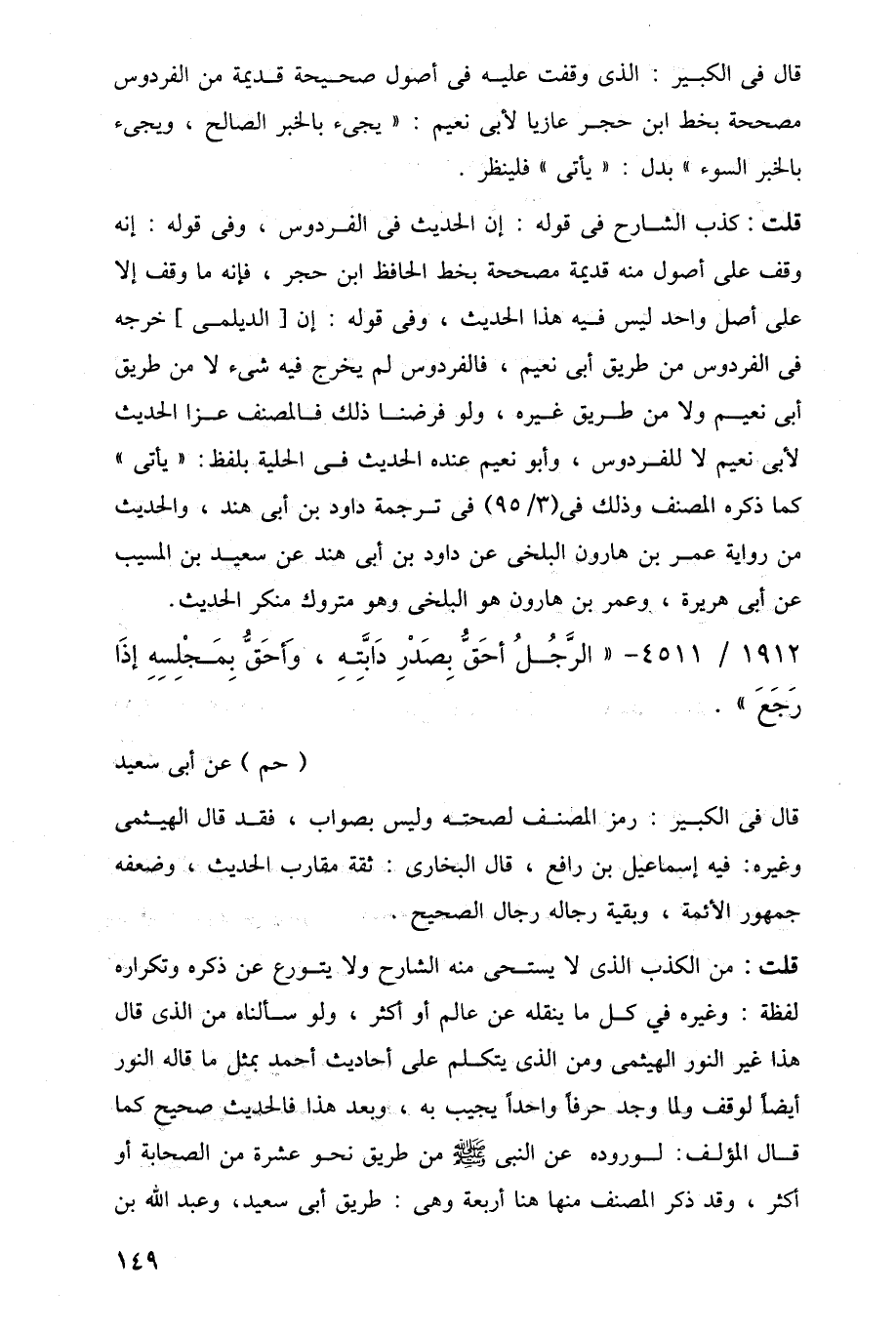 قلت: من الكذب الذي لا يستحى منه الشارح ولا يتورع عن ذكره وتكراره لفظة: وغيره في كل ما ينقله عن عالم أو أكثر، ولو سألناه من الذي قال هذا غير النور الهيثمى ومن الذي يتكلم على أحاديث أحمد بمثل ما قاله النور أيضًا لوقف ولما وجد حرفًا واحدًا يجيب به، وبعد هذا فالحديث صحيح كما قال المؤلف: لوروده عن النبي -صلى اللَّه عليه وسلم- من طريق نحو عشرة من الصحابة أو أكثر، وقد ذكر المصنف منها هنا أربعة وهى: طريق أبي سعيد، وعبد اللَّه بن