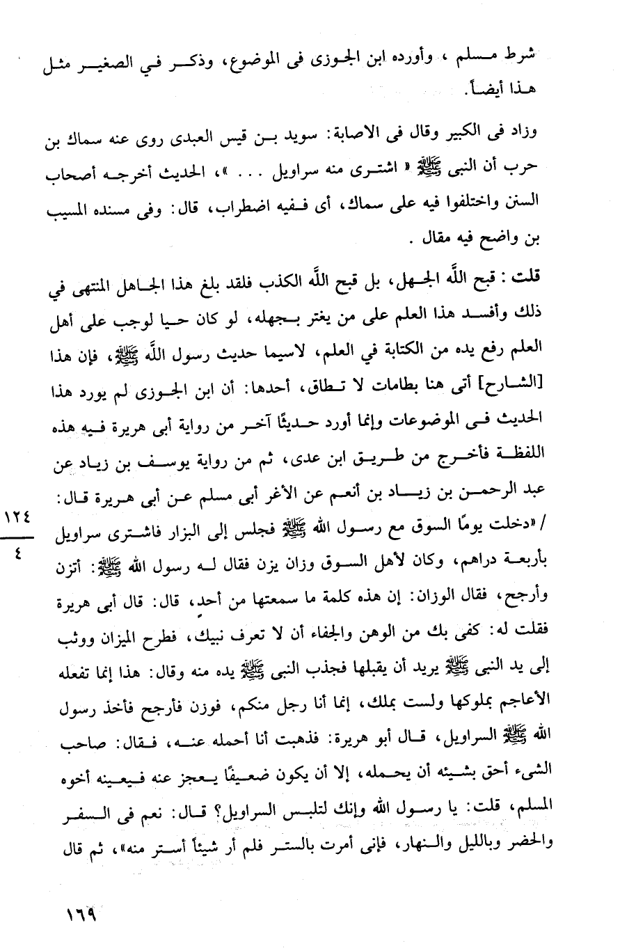 قلت: قبح اللَّه الجهل، بل قبح اللَّه الكذب فلقد بلغ هذا الجاهل المنتهى في ذلك وأفسد هذا العلم على من يغتر بجهله، لو كان حيا لوجب على أهل العلم رفع يده من الكتابة في العلم، لاسيما حديث رسول اللَّه -صلى اللَّه عليه وسلم-، فإن هذا [الشارح] أتى هنا بطامات لا تطاق، أحدها: أن ابن الجوزى لم يورد هذا الحديث في الموضوعات وإنما أورد حديثًا آخر من رواية أبي هريرة فيه هذه اللفظة فأخرج من طريق ابن عدى، ثم من رواية يوسف بن زياد عن عبد الرحمن بن زياد بن أنعم عن الأغر أبي مسلم عن أبي هريرة قال: "دخلت يومًا السوق مع رسول اللَّه -صلى اللَّه عليه وسلم- فجلس إلى البزار فاشترى سراويل بأربعة دراهم، وكان لأهل السوق وزان يزن فقال له رسول اللَّه -صلى اللَّه عليه وسلم-: أتزن وأرجح، فقال الوزان: إن هذه كلمة ما سمعتها من أحد، قال: قال أبي هريرة فقلت له: كفى بك من الوهن والجفاء أن لا تعرف نبيك، فطرح الميزان ووثب إلى يد النبي -صلى اللَّه عليه وسلم- يريد أن يقبلها فجذب النبي -صلى اللَّه عليه وسلم- يده منه وقال: هذا إنما تفعله الأعاجم بملوكها ولست بملك، إنما أنا رجل منكم، فوزن فأرجح فأخذ رسول اللَّه -صلى اللَّه عليه وسلم- السراويل، قال أبو هريرة: فذهبت أنا أحمله عنه، فقال: صاحب الشيء أحق بشيئه أن يحمله، إلا أن يكون ضعيفًا يعجز عنه فيعينه أخوه المسلم، قلت: يا رسول اللَّه وإنك لتلبس السراويل؟ قال: نعم في السفر والحضر وبالليل والنهار، فإنى أمرت بالستر فلم أر شيئًا أستر منه"، ثم قال