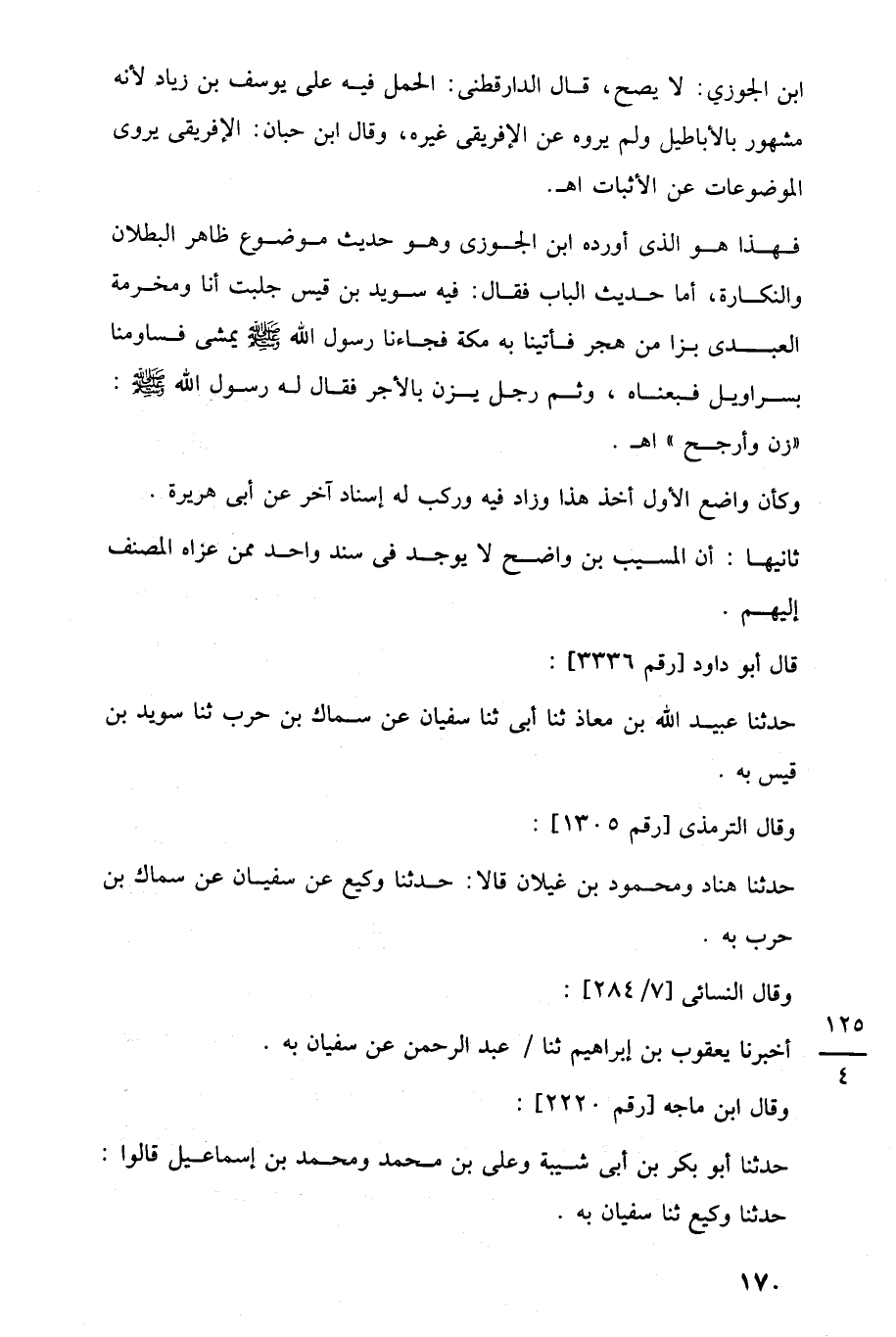 فهذا هو الذي أورده ابن الجوزى وهو حديث موضوع ظاهر البطلان والنكارة، أما حديث الباب فقال: فيه سويد بن قيس جلبت أنا ومخرمة العبدى بزا من هجر فأتينا به مكة فجاءنا رسول اللَّه -صلى اللَّه عليه وسلم- يمشى فساومنا بسراويل فبعناه، وثم رجل يزن بالأجر فقال له رسول اللَّه -صلى اللَّه عليه وسلم-: "زن وأرجح" اهـ.