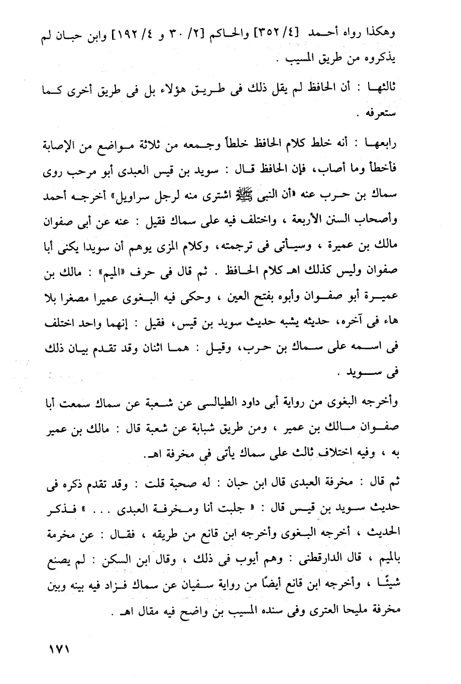 رابعها: أنه خلط كلام الحافظ خلطًا وجمعه من ثلاثة مواضع من الإصابة فأخطأ وما أصاب، فإن الحافظ قال: سويد بن قيس العبدى أبو مرحب روى سماك بن حرب عنه "أن النبي -صلى اللَّه عليه وسلم- اشترى منه لرجل سراويل" أخرجه أحمد وأصحاب السنن الأربعة، واختلف فيه على سماك فقيل: عنه عن أبي صفوان مالك بن عميرة، وسيأتى في ترجمته، وكلام المزى يوهم أن سويدا يكنى أبا صفوان وليس كذلك اهـ كلام الحافظ. ثم قال في حرف "الميم": مالك بن عميرة أبو صفوان وأبوه بفتح العين، وحكى فيه البغوى عميرا مصغرا بلا هاء في آخره، حديثه يشبه حديث سويد بن قيس، فقيل: إنهما واحد اختلف في اسمه على سماك بن حرب، وقيل: هما اثنان وقد تقدم بيان ذلك في سويد.