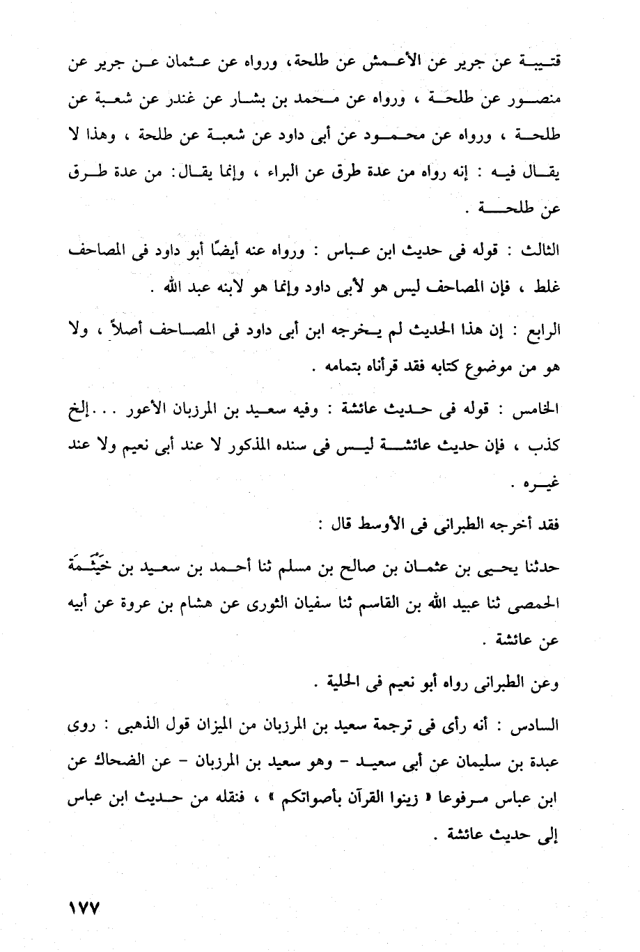 السادس: أنه رأى في ترجمة سعيد بن المرزبان من الميزان قول الذهبى: روى عبدة بن سليمان عن أبي سعيد -وهو سعيد بن المرزبان- عن الضحاك عن ابن عباس مرفوعًا "زينوا القرآن بأصواتكم"، فنقله من حديث ابن عباس إلى حديث عائشة.