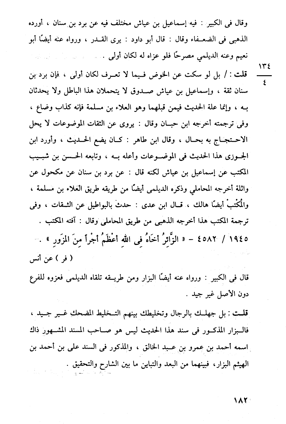 قلت: بل لو سكت عن الخوض فيما لا تعرف لكان أولى، فإن برد بن سنان ثقة، وإسماعيل بن عياش صدوق لا يتحملان هذا الباطل ولا يحدثان به، وإنما علة الحديث فيمن قبلهما وهو العلاء بن مسلمة فإنه كذاب وضاع، وفي ترجمته أخرجه ابن حبان وقال: يروى عن الثقات الموضوعات لا يحل الاحتجاج به بحال، وقال ابن طاهر: كان يضع الحديث، وأورد ابن الجوزى هذا الحديث في الموضوعات وأعله به، وتابعه الحسن بن شبيب المكتب عن إسماعيل بن عياش لكنه قال: عن برد بن سنان عن مكحول عن واثلة أخرجه المحاملى وذكره الديلمى أيضًا من طريقه طريق العلاء بن مسلمة، والمُكتب أيضًا هالك، قال ابن عدى: حدث بالبواطيل عن الثقات، وفي ترجمة المكتب هذا أخرجه الذهبى من طريق المحاملى وقال: آفته المكتب.