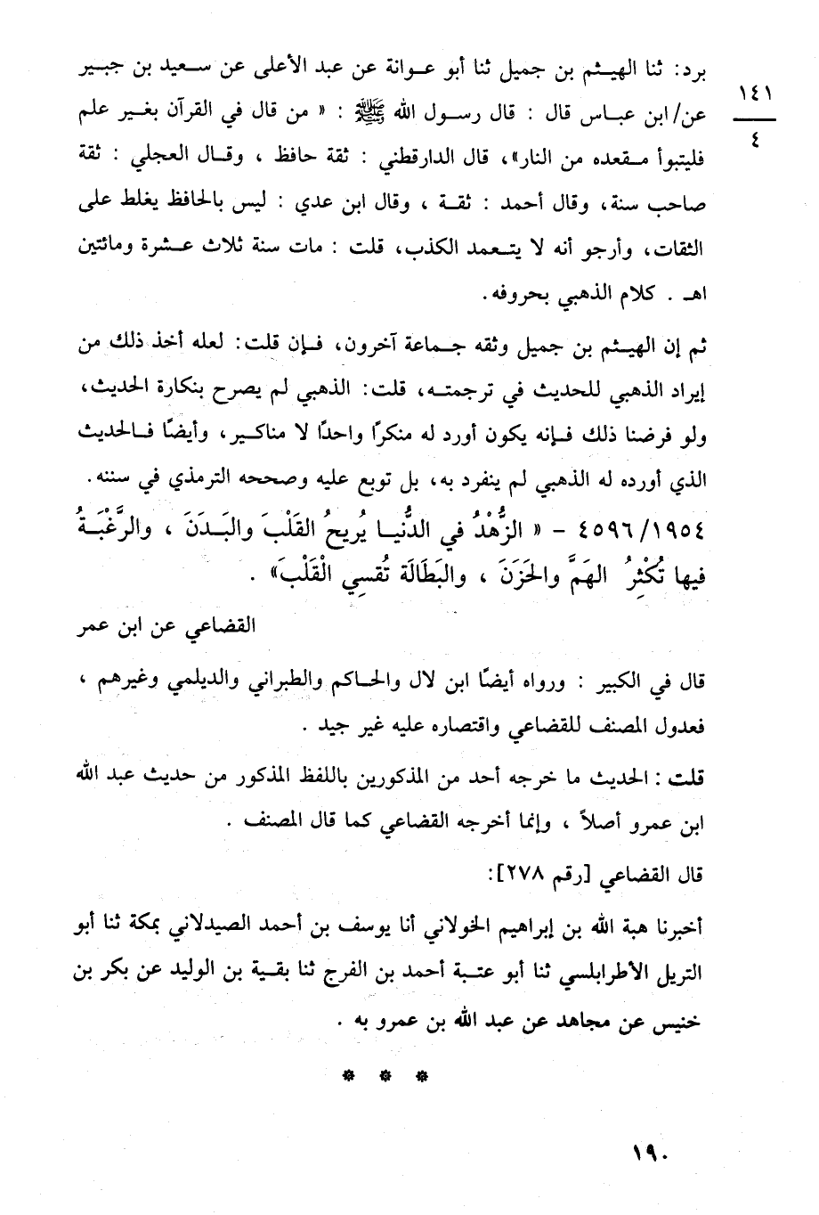 برد: ثنا الهيثم بن جميل ثنا أبو عوانة عن عبد الأعلى عن سعيد بن جبير عن ابن عباس قال: قال رسول اللَّه -صلى اللَّه عليه وسلم-: "من قال في القرآن بغير علم فليتبوأ مقعده من النار"، قال الدارقطنى: ثقة حافظ، وقال العجلي: ثقة صاحب سنة، وقال أحمد: ثقة، وقال ابن عدى: ليس بالحافظ يغلط على الثقات، وأرجو أنه لا يتعمد الكذب، قلت: مات سنة ثلاث عشرة ومائتين اهـ. كلام الذهبى بحروفه.