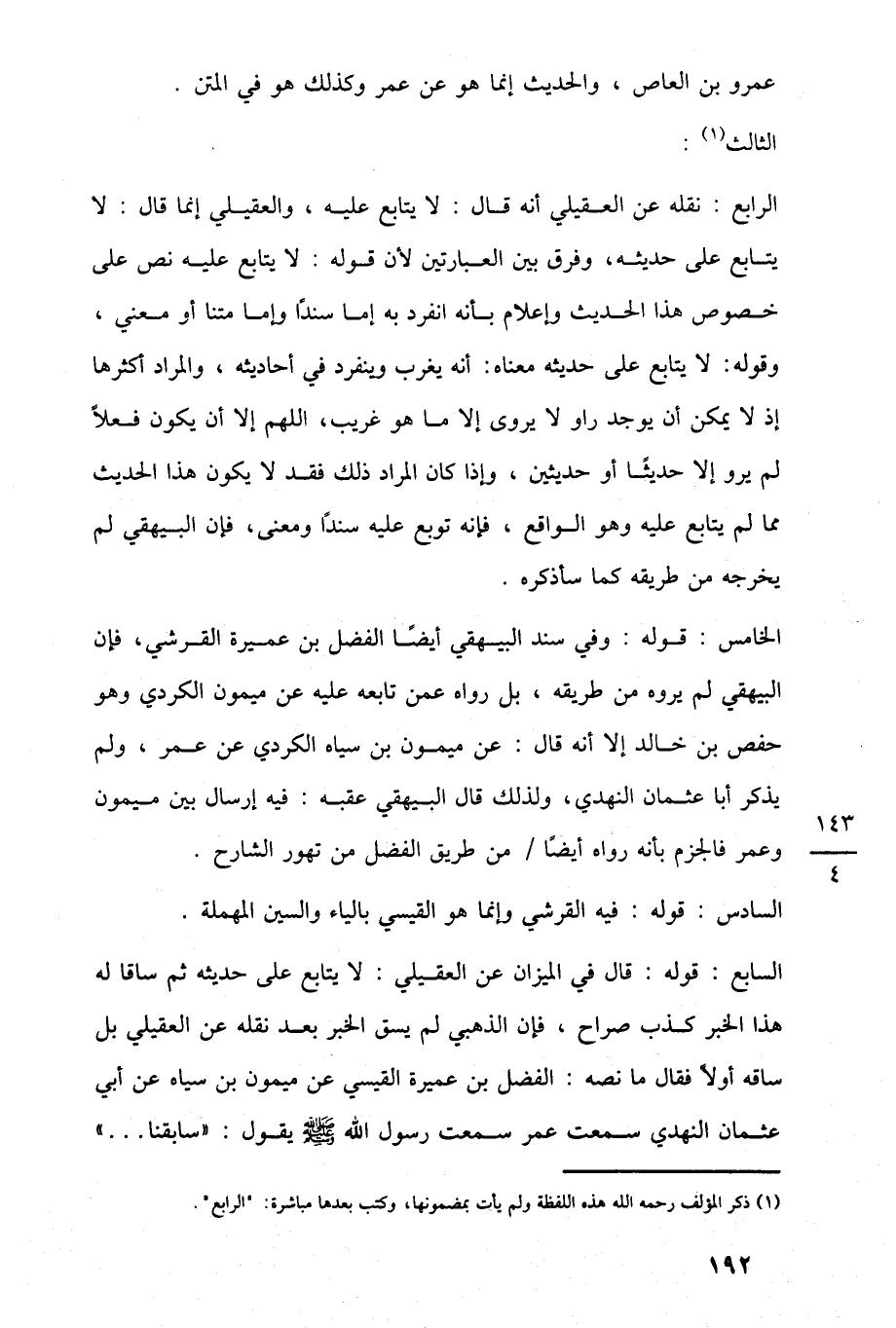 الرابع: نقله عن العقيلى أنه قال: لا يتابع عليه، والعقيلى إنما قال: لا يتابع على حديثه، وفرق بين العبارتين لأن قوله: لا يتابع عليه نص على خصوص هذا الحديث وإعلام بأنه انفرد به إما سندًا وإما متنا أو معني، وقوله: لا يتابع على حديثه معناه: أنه يغرب وينفرد في أحاديثه، والمراد أكثرها إذ لا يمكن أن يوجد راو لا يروى إلا ما هو غريب، اللهم إلا أن يكون فعلًا لم يرو إلا حديثًا أو حديثين، وإذا كان المراد ذلك فقد لا يكون هذا الحديث مما لم يتابع عليه وهو الواقع، فإنه توبع عليه سندًا ومعنى، فإن البيهقى لم يخرجه من طريقه كما سأذكره.