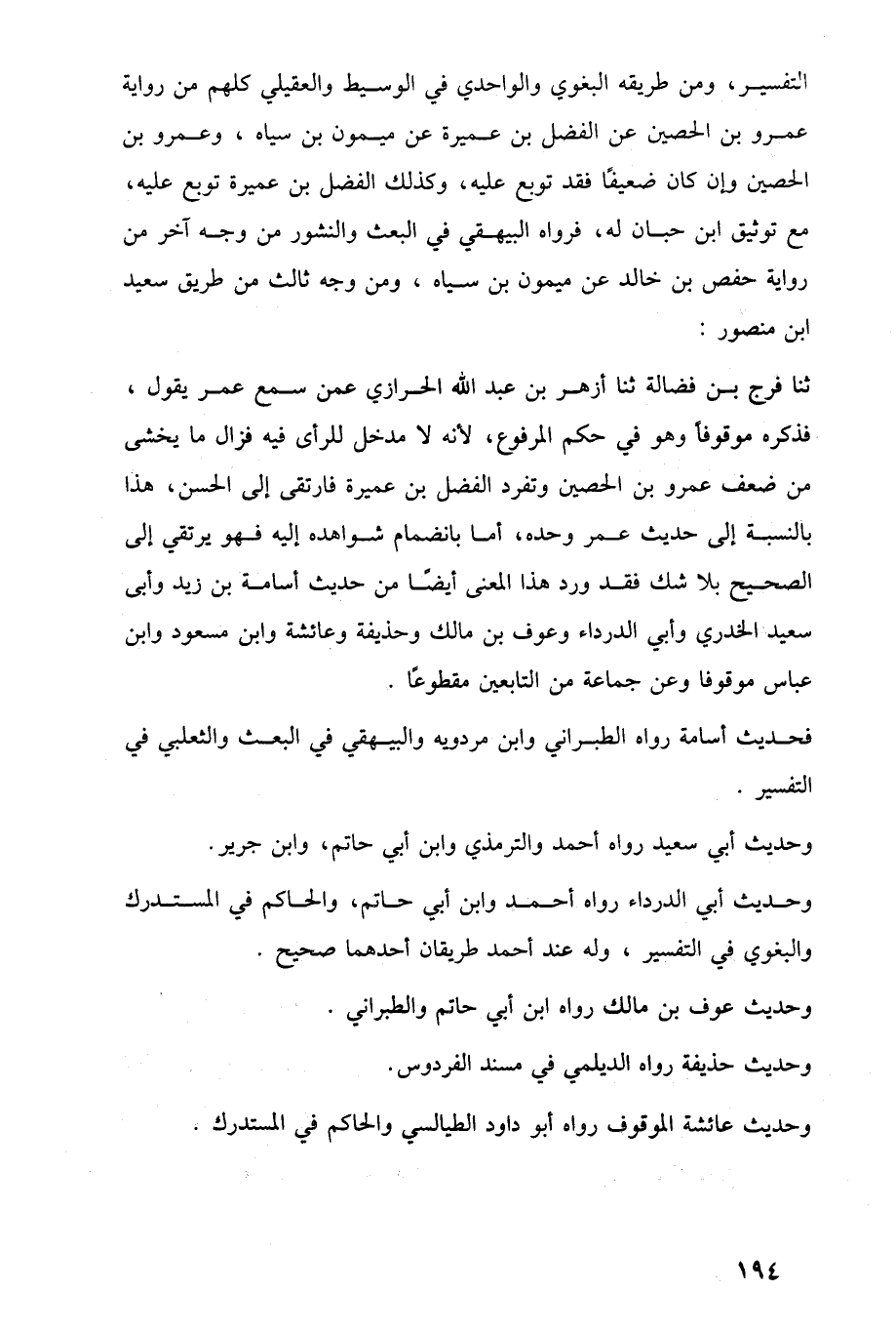 التفسير، ومن طريقه البغوى والواحدي في الوسيط والعقيلي كلهم من رواية عمرو بن الحصين عن الفضل بن عميرة عن ميمون بن سياه، وعمرو بن الحصين وإن كان ضعيفًا فقد توبع عليه، وكذلك الفضل بن عميرة توبع عليه، مع توثيق ابن حبان له، فرواه البيهقى في البعث والنشور من وجه آخر من رواية حفص بن خالد عن ميمون بن سياه، ومن وجه ثالث من طريق سعيد ابن منصور: