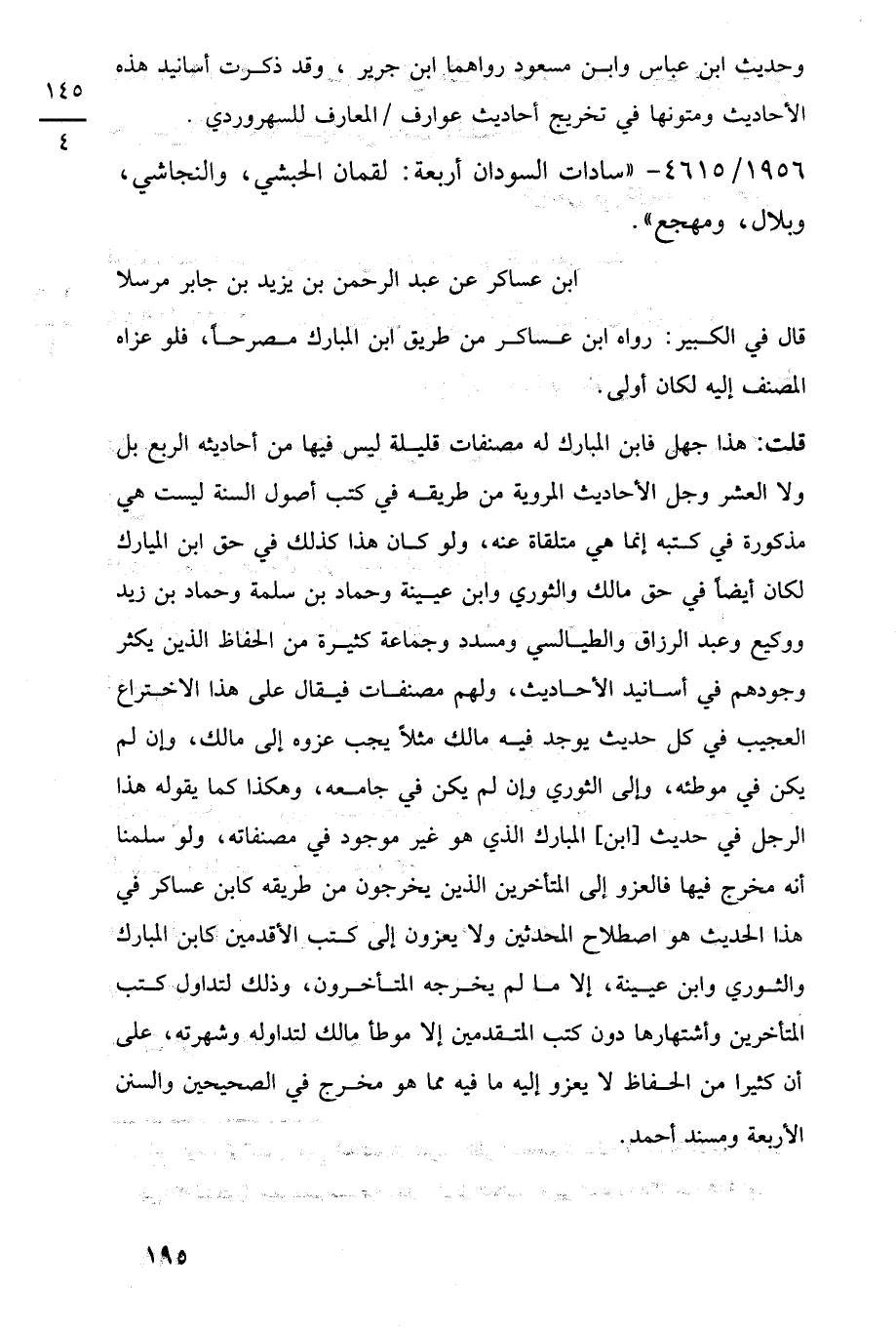 قلت: هذا جهل فابن المبارك له مصنفات قليلة ليس فيها من أحاديثه الربع بل ولا العشر وجل الأحاديث المروية من طريقه في كتب أصول السنة ليست هي مذكورة في كتبه إنما هي متلقاة عنه، ولو كان هذا كذلك في حق ابن الميارك لكان أيضًا في حق مالك والثوري وابن عيينة وحماد بن سلمة وحماد بن زيد ووكيع وعبد الرزاق والطيالسي ومدد وجماعة كثيرة من الحفاظ الذين يكثر وجودهم في أسانيد الأحاديث، ولهم مصنفات فيقال على هذا الاختراع العجيب في كل حديث يوجد فيه مالك مثلًا يجب عزوه إلى مالك، وإن لم يكن في موطئه، وإلى الثورى وإن لم يكن في جامعه، وهكذا كما يقوله هذا الرجل في حديث [ابن] المبارك الذي هو غير موجود في مصنفاته، ولو سلمنا أنه مخرج فيها فالعزو إلى المتأخرين الذين يخرجون من طريقه كابن عساكر في هذا الحديث هو اصطلاح المحدثين ولا يعزون إلى كتب الأقدمين كابن المبارك والثوري وابن عيينة، إلا ما لم يخرجه المتأخرون، وذلك لتداول كتب المتأخرين وأشتهارها دون كتب المتقدمين إلا موطأ مالك لتداوله وشهرته، على أن كثيرا من الحفاظ لا يعزو إليه ما فيه مما هو مخرج في الصحيحين والسنن الأربعة ومسند أحمد.