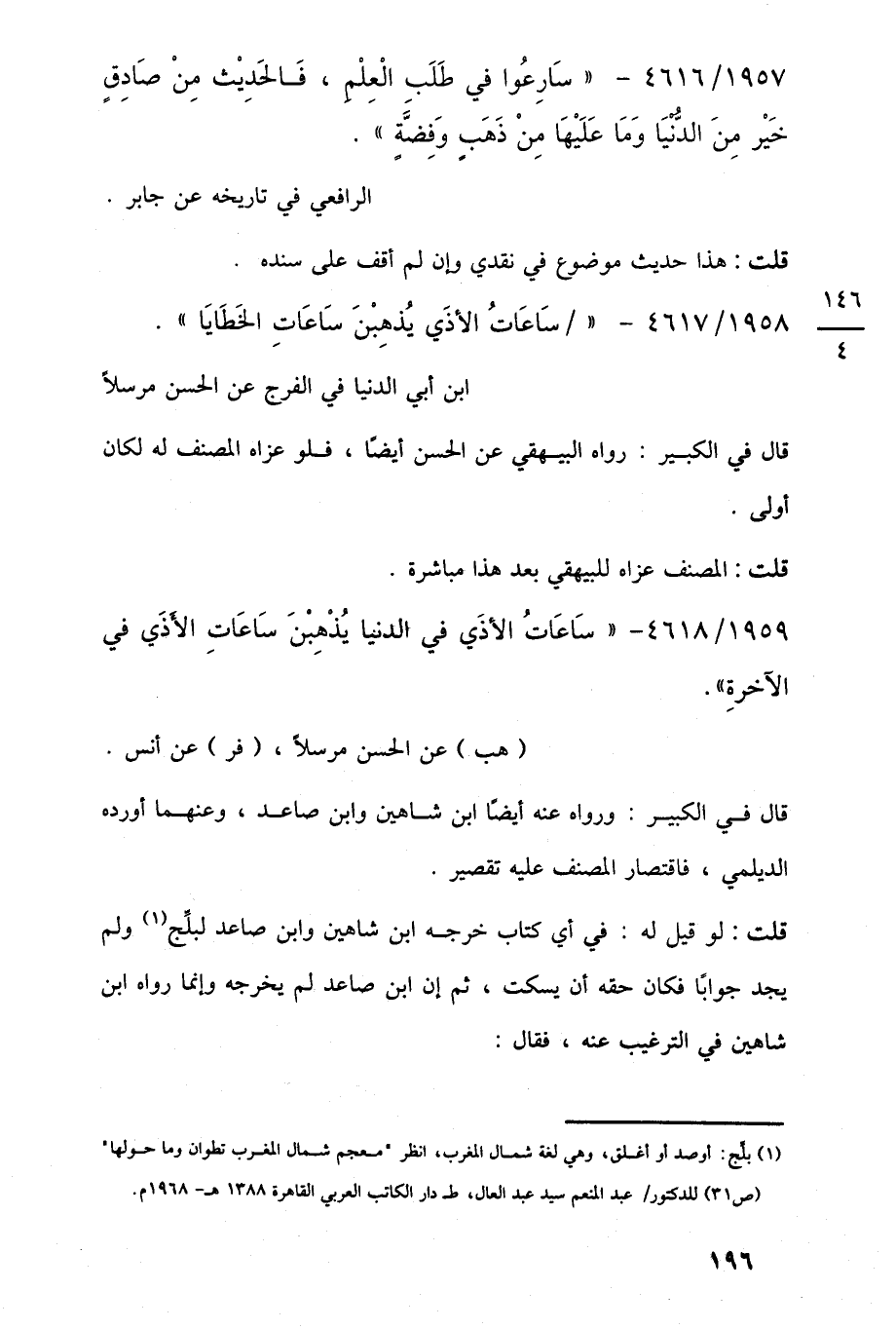 1957/ 4616 - "سَارِعُوا في طَلَبِ الْعِلْمِ، فَالحَدِيْث مِنْ صَادِقٍ خَيْر مِنَ الدُّنْيَا وَمَا عَلَيْهَا مِنْ ذَهَبٍ وَفِضَّةٍ".