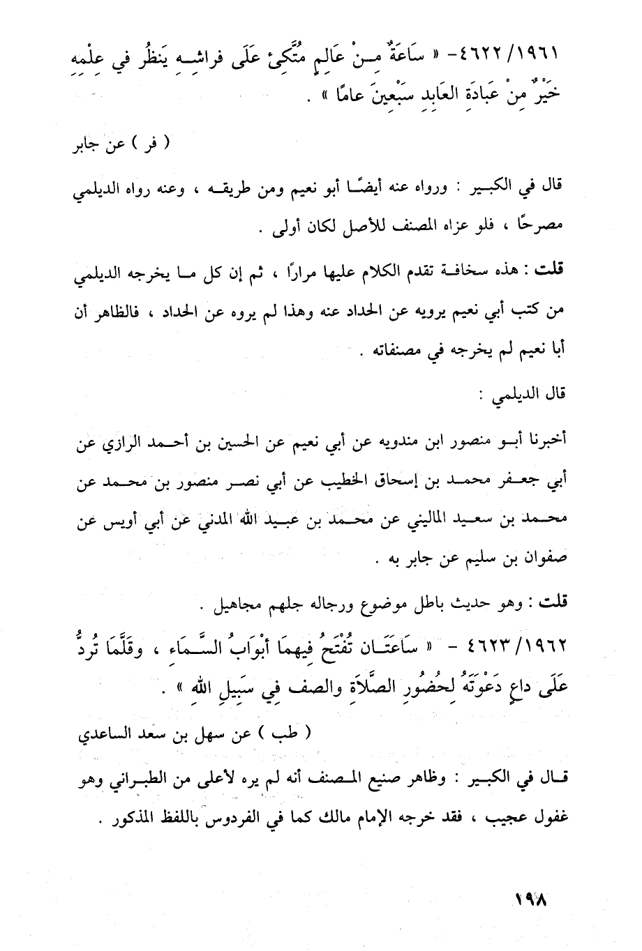 1961/ 4622 - "سَاعَةٌ مِنْ عَالِمٍ مُتَّكِئ عَلَى فراشِهِ يَنظُر في عِلْمِهِ خَيْرٌ مِنْ عَبادَةِ العَابِدِ سَبْعِينَ عامًا".