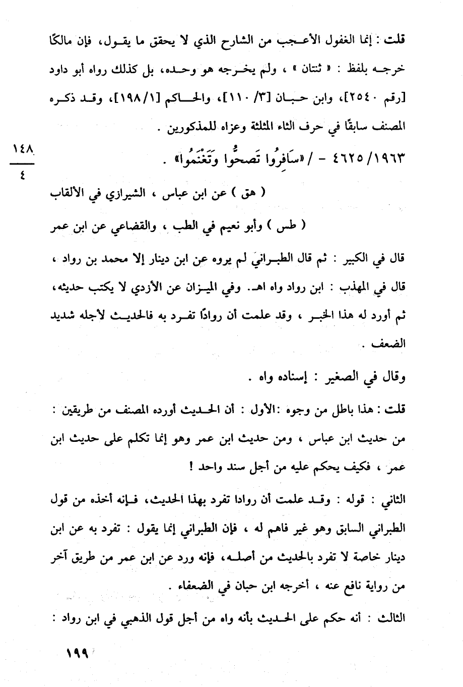 الثانى: قوله: وقد علمت أن روادا تفرد بهذا الحديث، فإنه أخذه من قول الطبرانى السابق وهو غير فاهم له، فإن الطبراني إنما يقول: تفرد به عن ابن دينار خاصة لا تفرد بالحديث من أصله، فإنه ورد عن ابن عمر من طريق آخر من رواية نافع عنه، أخرجه ابن حبان في الضعفاء.