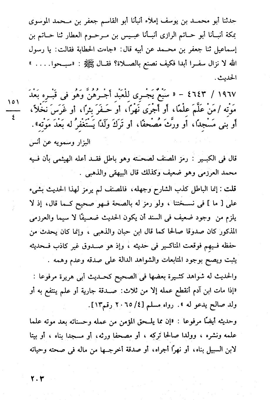 1967/ 4643 - "سَبْعٌ يَجْرِى لِلْعَبْدِ أَجْرُهُنَّ وَهُو في قَبْرِهِ بَعْدَ مَوْتِه مَنْ عَلَّمَ علْمًا، أَو أَجْرَى نَهْرًا، أوَ حَفَرَ بِئرًا، أو غَرَسَ نخلًا، أو بَنى مَسْجِدًا، أَو ورَّثَ مُصْحفًا، أو تَرَكَ وَلَدًا يَسْتَغْفِرُ له بَعْدَ مَوْتِهِ".